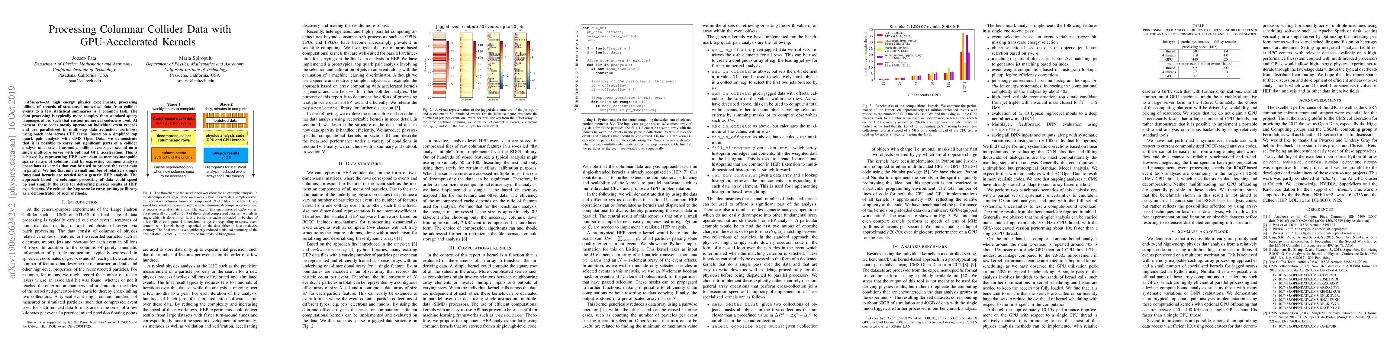 At high energy physics experiments, processing billions of records of structured numerical data from collider events to a few statistical summaries is a common task. The data processing is typically more complex than standard query languages allow, such that custom numerical codes are used. At present, these codes mostly operate on individual event records and are parallelized in multi-step data reduction workflows using batch jobs across CPU farms. Based on a simplified top quark pair analysis with CMS Open Data, we demonstrate that it is possible to carry out significant parts of a collider analysis at a rate of around a million events per second on a single multicore server with optional GPU acceleration. This is achieved by representing HEP event data as memory-mappable sparse arrays of columns, and by expressing common analysis operations as kernels that can be used to process the event data in parallel. We find that only a small number of relatively simple functional kernels are needed for a generic HEP analysis. The approach based on columnar processing of data could speed up and simplify the cycle for delivering physics results at HEP experiments. We release the \texttt{hepaccelerate} prototype library as a demonstrator of such methods.