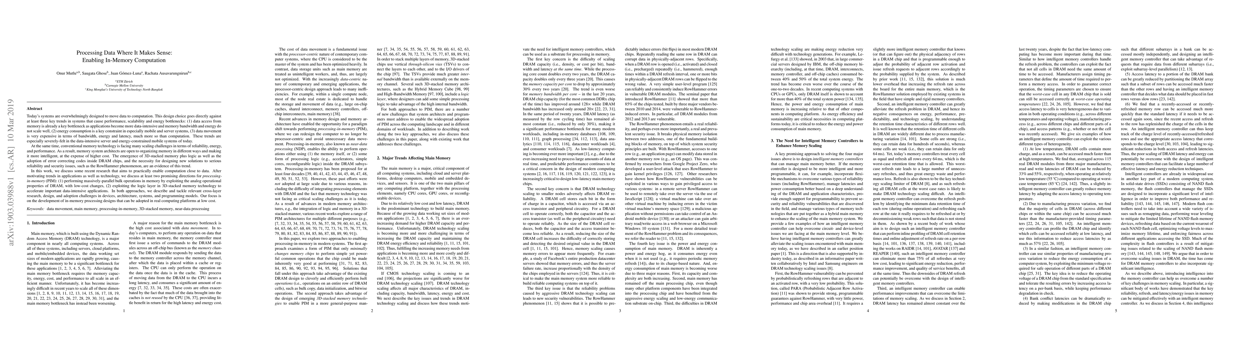 This paper explores the concept of processing data in memory to address performance, scalability, and energy bottlenecks caused by moving data to computation. It discusses two promising directions for processing-in-memory: leveraging the analog operational properties of DRAM and utilizing the logic layer in 3D-stacked memory technology, while addressing cross-layer challenges in device, architecture, system, and programming model design.