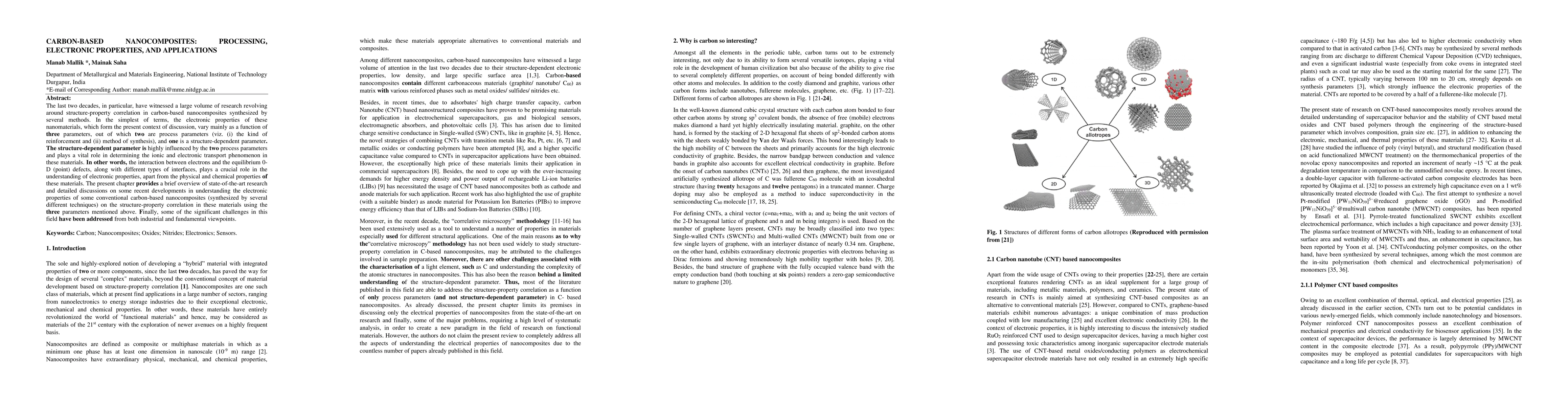 The last two decades, in particular, have witnessed a large volume of research revolving around structure-property correlation in Carbon based nanocomposites, synthesized by several methods.In the simplest of terms, the electronic properties of these nanomaterials, which form the present context of discussion, vary mainly as a function of three parameters, out of which 2 are process parameters (viz. the kind of reinforcement and method of synthesis) and one is a structure-dependent parameter which is highly influenced by the two aforementioned process parameters and plays a vital role in determining the ionic and electronic transport phenomenon in these materials. To be more specific in the context of structure dependent parameter, the interaction between electrons and the equilibrium 0D (point) defects, along with different types of interfaces, plays a crucial role in the understanding of electronic properties, apart from physical and chemical properties in these materials. These materials find applications in a large number of sectors, such as nanoelectronics, supercapacitors, absorbent, photocatalytic, photovoltaic, solar cells, sensors, and energy storage due to their exceptional electronic, mechanical and chemical properties. The present chapter will intend to focus primarily on providing a brief overview of the state-of-the-art on research along with detailed discussions on some recent developments in determining and understanding electronic properties of some conventional Carbon-based nanocomposites (synthesized by several different techniques) based on the structure property correlation of these materials and finally, address some of the significant challenges in this field.