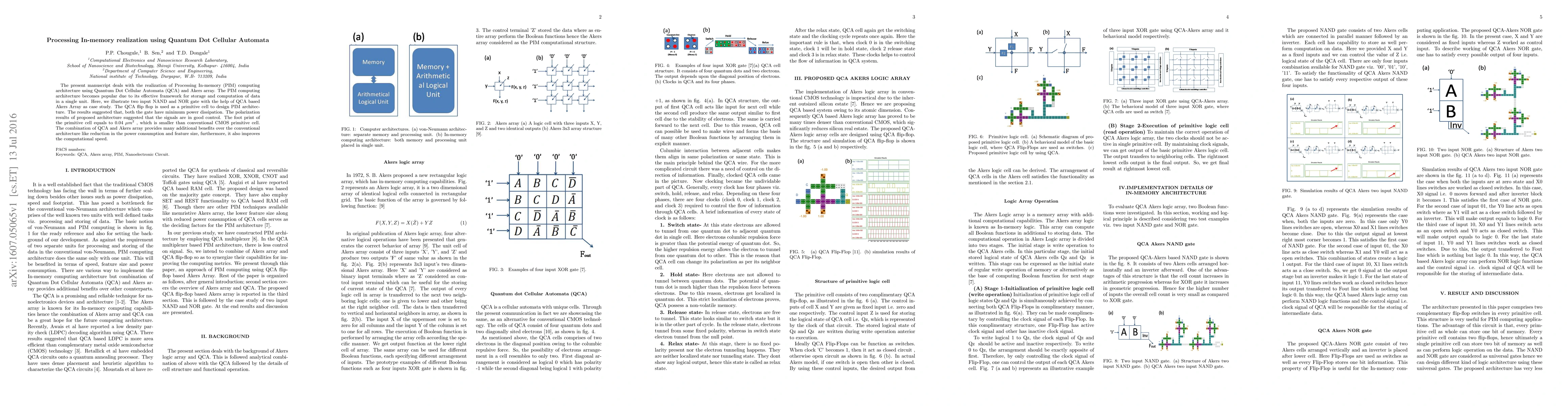 This research proposes a Processing In-memory (PIM) computing architecture using Quantum Dot Cellular Automata (QCA) and Akers array, demonstrating low power consumption and small footprint. The QCA flip-flop, as a primitive cell, successfully designs NAND and NOR gates, offering benefits like reduced power usage, feature size, and improved computational speed compared to conventional architectures.