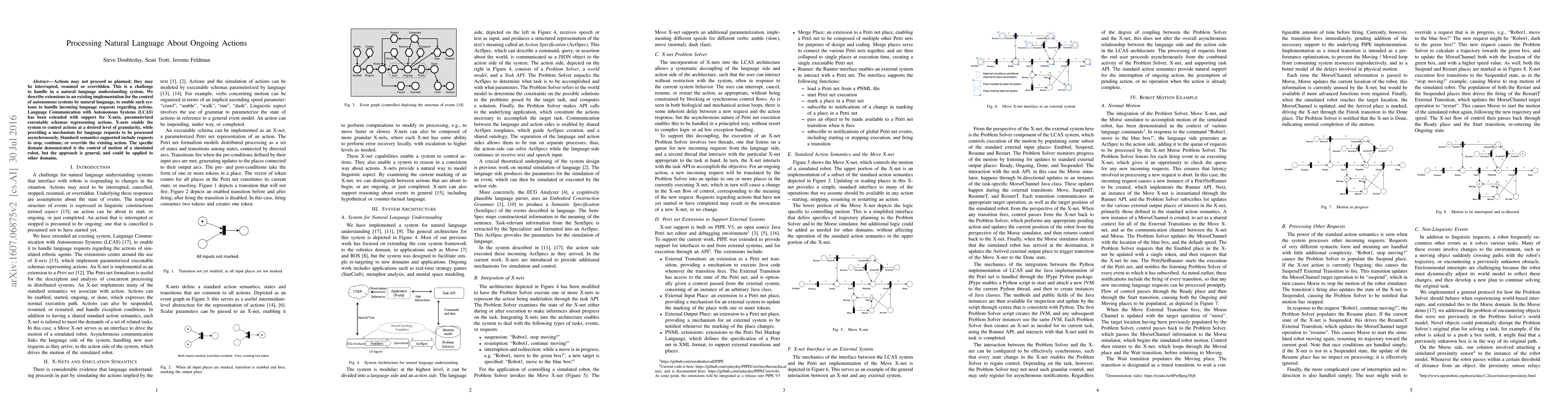 Actions may not proceed as planned; they may be interrupted, resumed or overridden. This is a challenge to handle in a natural language understanding system. We describe extensions to an existing implementation for the control of autonomous systems by natural language, to enable such systems to handle incoming language requests regarding actions. Language Communication with Autonomous Systems (LCAS) has been extended with support for X-nets, parameterized executable schemas representing actions. X-nets enable the system to control actions at a desired level of granularity, while providing a mechanism for language requests to be processed asynchronously. Standard semantics supported include requests to stop, continue, or override the existing action. The specific domain demonstrated is the control of motion of a simulated robot, but the approach is general, and could be applied to other domains.