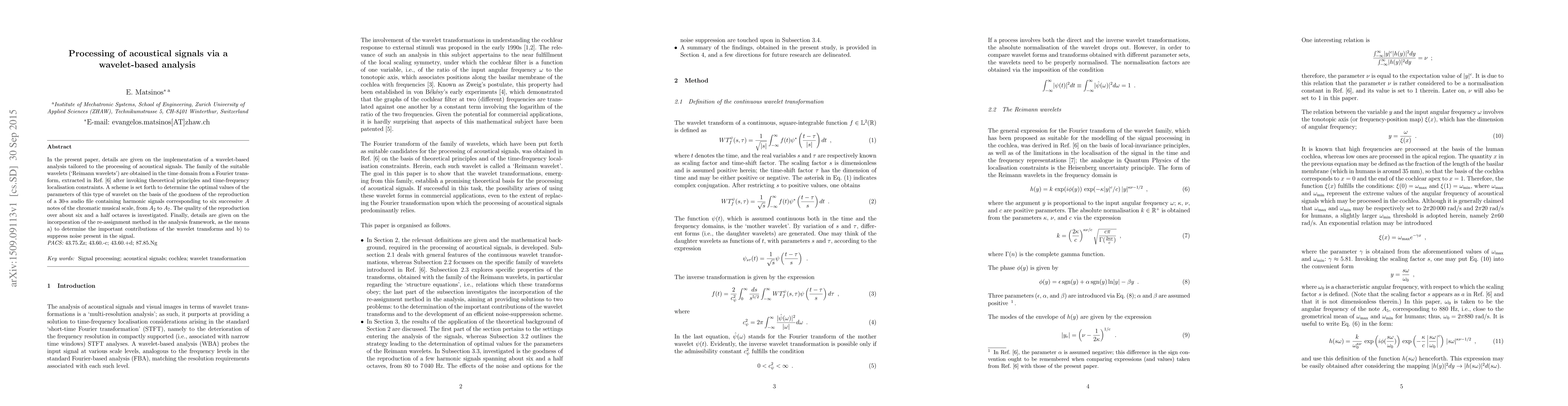 This paper details a wavelet-based analysis for processing acoustical signals, specifically using Reimann wavelets derived from Fourier transforms. The study evaluates the reproduction quality of a 30-s audio file across six octaves and incorporates the re-assignment method to enhance signal clarity and suppress noise.