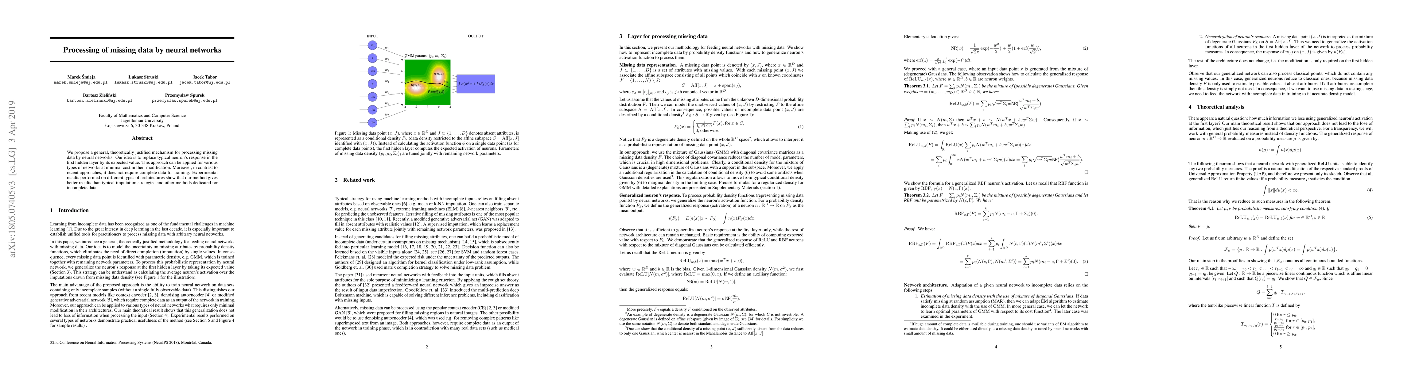 We propose a general, theoretically justified mechanism for processing missing data by neural networks. Our idea is to replace typical neuron's response in the first hidden layer by its expected value. This approach can be applied for various types of networks at minimal cost in their modification. Moreover, in contrast to recent approaches, it does not require complete data for training. Experimental results performed on different types of architectures show that our method gives better results than typical imputation strategies and other methods dedicated for incomplete data.