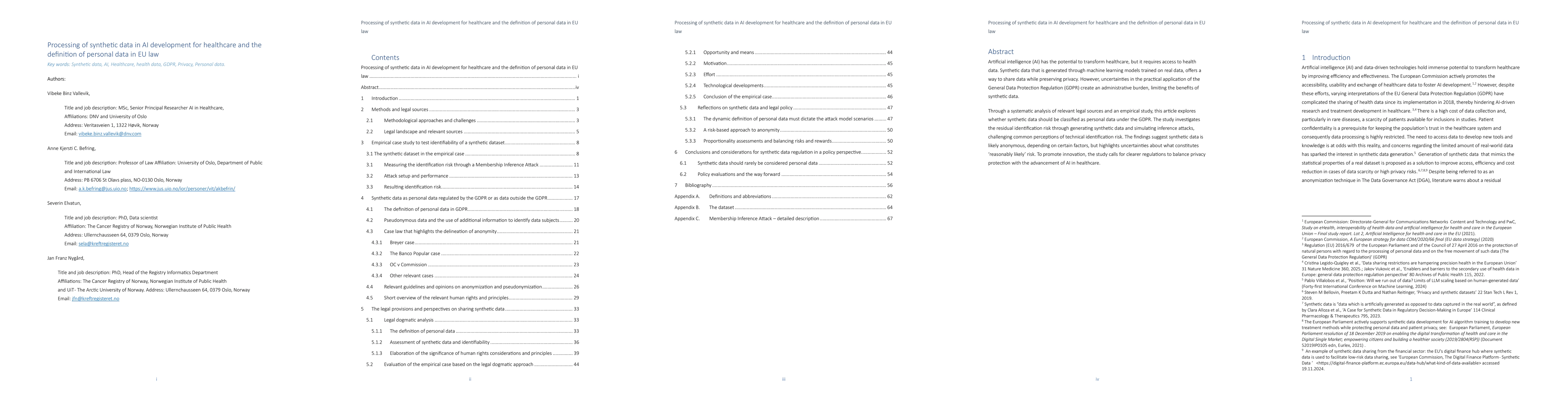 Artificial intelligence (AI) has the potential to transform healthcare, but it requires access to health data. Synthetic data that is generated through machine learning models trained on real data, offers a way to share data while preserving privacy. However, uncertainties in the practical application of the General Data Protection Regulation (GDPR) create an administrative burden, limiting the benefits of synthetic data. Through a systematic analysis of relevant legal sources and an empirical study, this article explores whether synthetic data should be classified as personal data under the GDPR. The study investigates the residual identification risk through generating synthetic data and simulating inference attacks, challenging common perceptions of technical identification risk. The findings suggest synthetic data is likely anonymous, depending on certain factors, but highlights uncertainties about what constitutes reasonably likely risk. To promote innovation, the study calls for clearer regulations to balance privacy protection with the advancement of AI in healthcare.