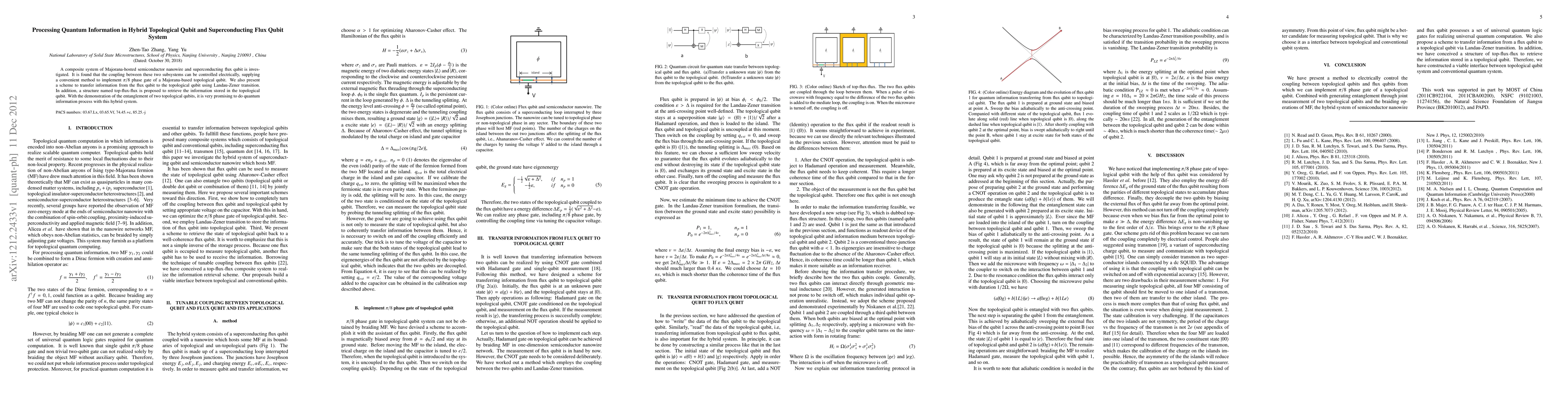 This paper investigates a hybrid system combining a Majorana-hosted semiconductor nanowire with a superconducting flux qubit, demonstrating electrically controlled coupling and a method for implementing a topological qubit's π/8 phase gate. It also proposes a scheme for information transfer and retrieval, showing potential for quantum information processing.