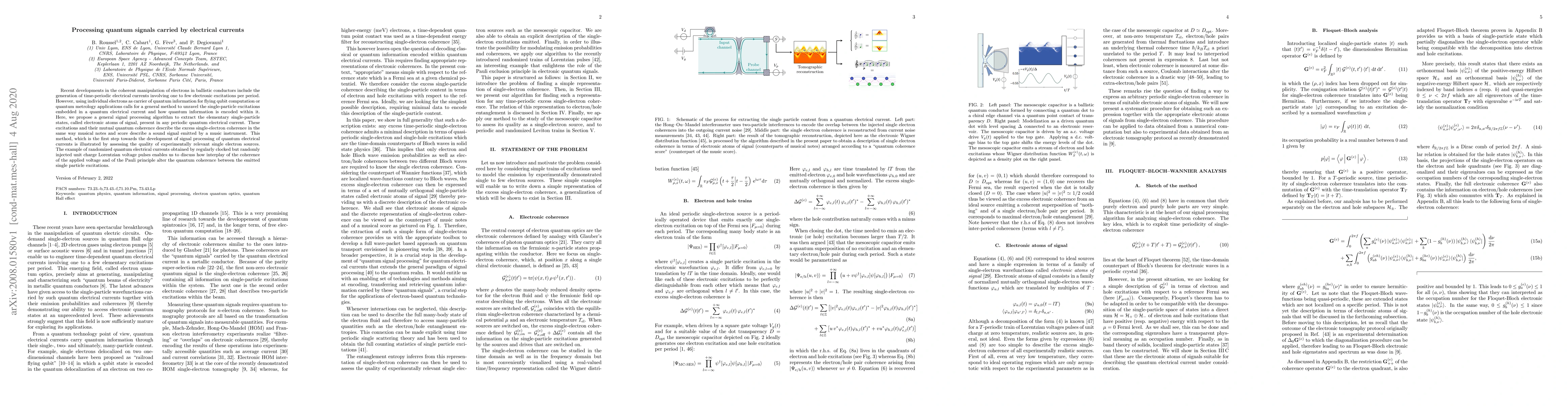 Recent developments in the coherent manipulation of electrons in ballistic conductors include the generation of time-periodic electrical currents involving one to few electronic excitations per period. However, using individual electrons as carrier of quantum information for flying qubit computation or quantum metrology applications calls for a general method to unravel the single-particle excitations embedded in a quantum electrical current and how quantum information is encoded within it. Here, we propose a general signal processing algorithm to extract the elementary single-particle states, called electronic atoms of signal, present in any periodic quantum electrical current. These excitations and their mutual quantum coherence describe the excess single-electron coherence in the same way musical notes and score describe a sound signal emitted by a music instrument. This method, which is the first step towards the development of signal processing of quantum electrical currents is illustrated by assessing the quality of experimentally relevant single electron sources. The example of randomized quantum electrical currents obtained by regularly clocked but randomly injected unit charge Lorentzian voltage pulses enables us to discuss how interplay of the coherence of the applied voltage and of the Pauli principle alter the quantum coherence between the emitted single particle excitations.