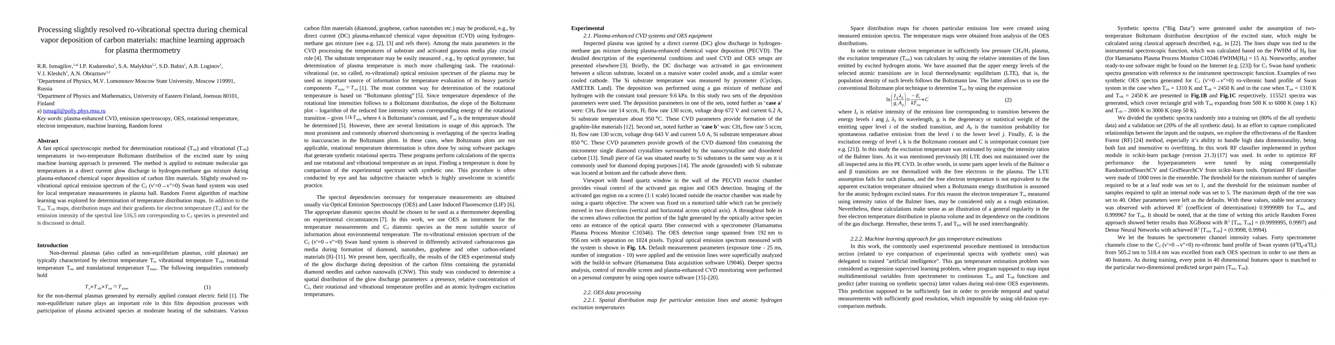 This research introduces a machine learning method using Random Forest algorithm to estimate rotational (T_rot) and vibrational (T_vib) temperatures in plasma during carbon film deposition from a hydrogen-methane mixture. The technique analyzes the slightly resolved ro-vibrational spectrum of the C2 (ν'=0 → ν''=0) Swan band system, providing temperature distribution maps along with gradients for electron temperature (T_e) and emission intensity at 516.5 nm for C2 species.
