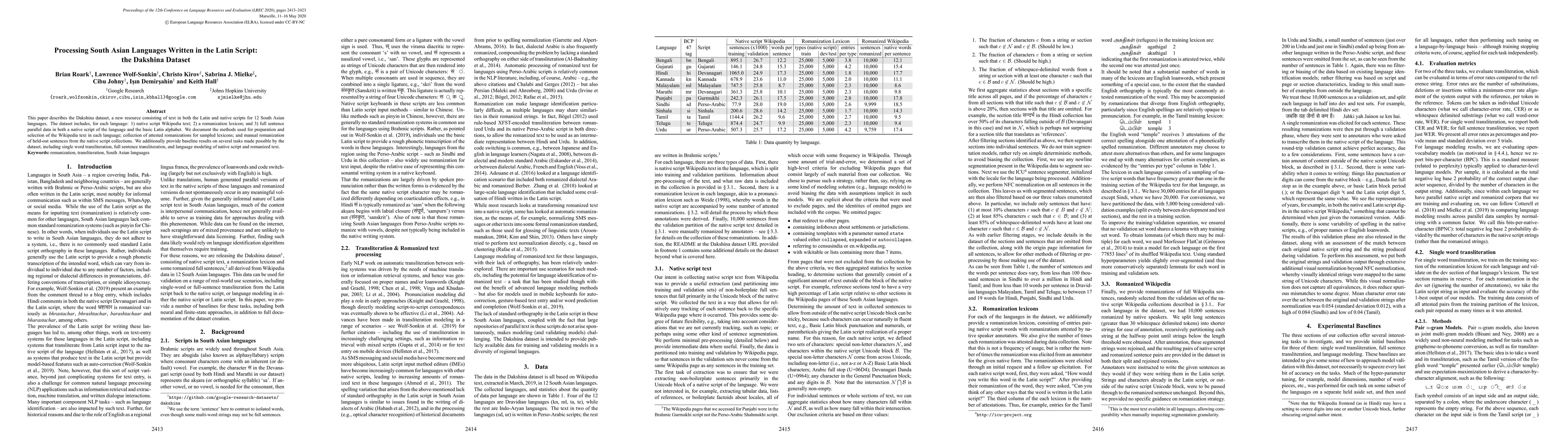 Summary: The Dakshina dataset provides text in both Latin and native scripts for 12 South Asian languages, including Wikipedia excerpts, romanization lexicons, and parallel sentence data. The paper details the dataset's preparation and presents baseline results for transliteration and language modeling tasks.