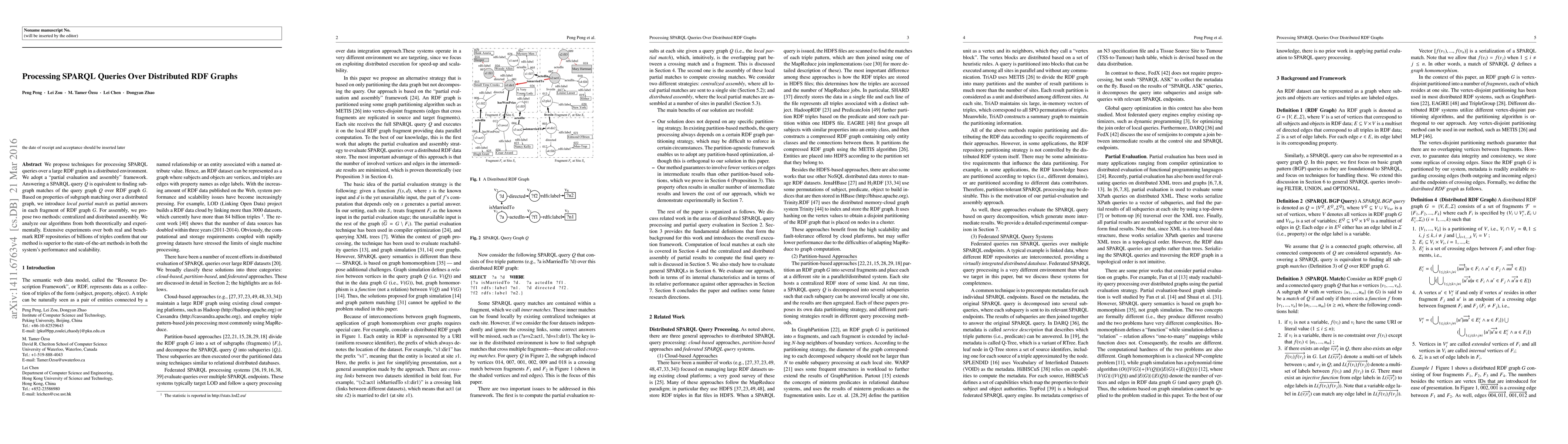 This paper proposes techniques for processing SPARQL queries in a distributed environment using a "partial evaluation and assembly" framework, achieving superior performance and scalability compared to existing methods through local partial match and centralized/distributed assembly strategies. Experimental results on large RDF datasets validate the effectiveness of the proposed approach.