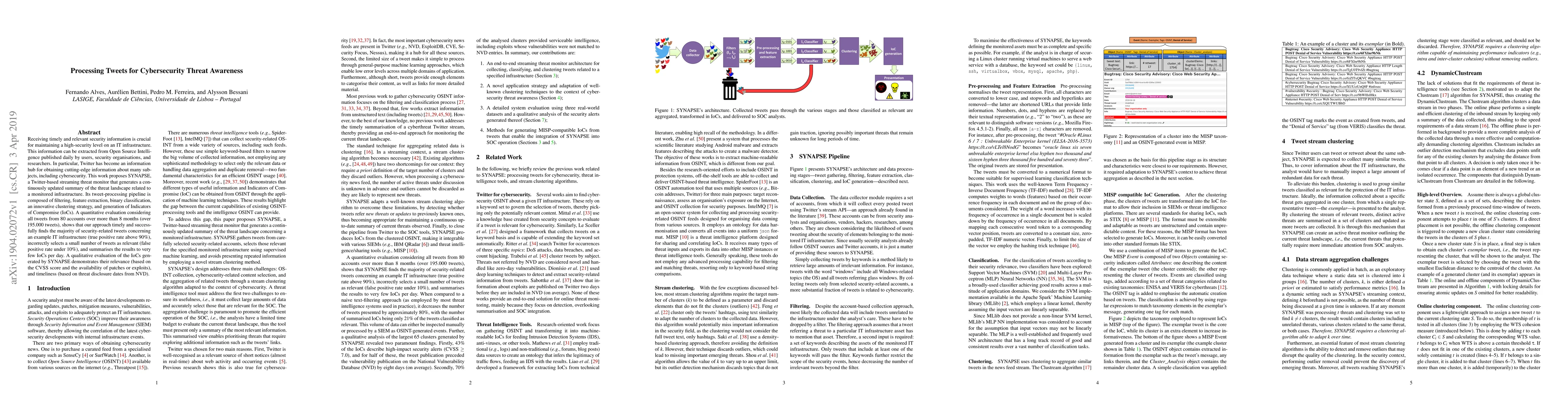 The paper introduces SYNAPSE, a Twitter-based system that continuously updates a threat summary for a specific IT infrastructure. It uses a tweet-processing pipeline for filtering, feature extraction, classification, clustering, and IoC generation. Evaluation over 195,000 tweets from 80 accounts shows high true positive rates (above 90%) and low false positive rates (under 10%), effectively summarizing results into few daily IoCs. Qualitative analysis confirms IoC relevance and timeliness.