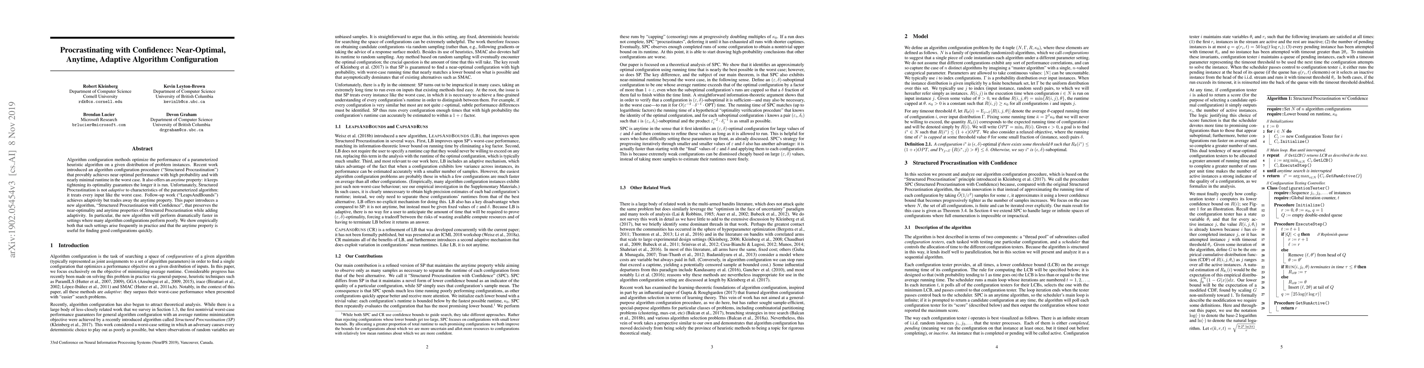 Algorithm configuration methods optimize the performance of a parameterized heuristic algorithm on a given distribution of problem instances. Recent work introduced an algorithm configuration procedure ("Structured Procrastination") that provably achieves near optimal performance with high probability and with nearly minimal runtime in the worst case. It also offers an $\textit{anytime}$ property: it keeps tightening its optimality guarantees the longer it is run. Unfortunately, Structured Procrastination is not $\textit{adaptive}$ to characteristics of the parameterized algorithm: it treats every input like the worst case. Follow-up work ("LeapsAndBounds") achieves adaptivity but trades away the anytime property. This paper introduces a new algorithm, "Structured Procrastination with Confidence", that preserves the near-optimality and anytime properties of Structured Procrastination while adding adaptivity. In particular, the new algorithm will perform dramatically faster in settings where many algorithm configurations perform poorly. We show empirically both that such settings arise frequently in practice and that the anytime property is useful for finding good configurations quickly.