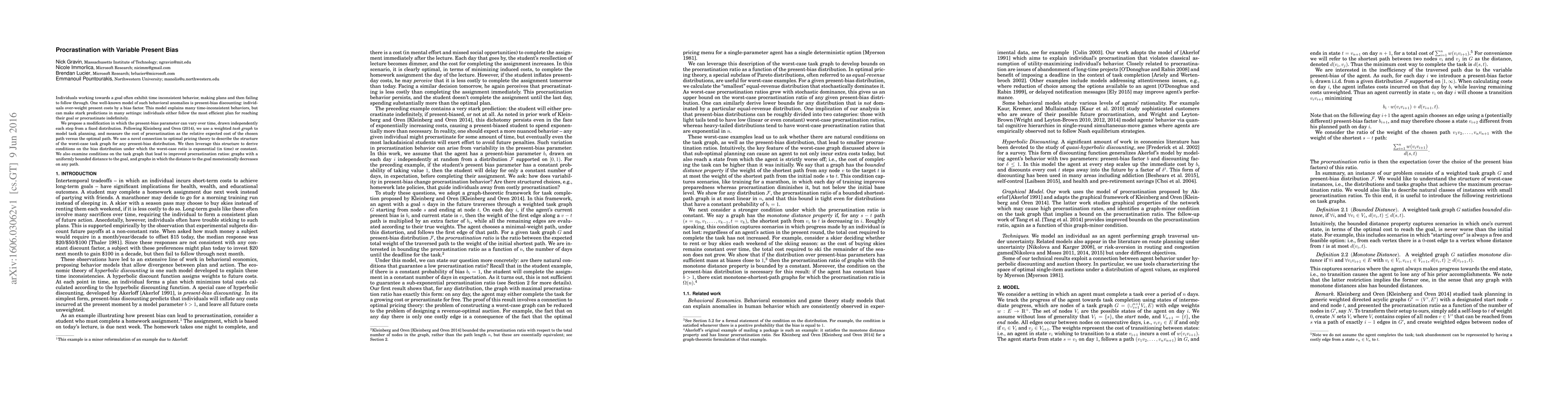 A research paper proposes a modification to present-bias discounting models of procrastination, introducing variability in the bias factor over time, and explores conditions for exponential or constant worst-case task graphs under different distributions and task structures.
