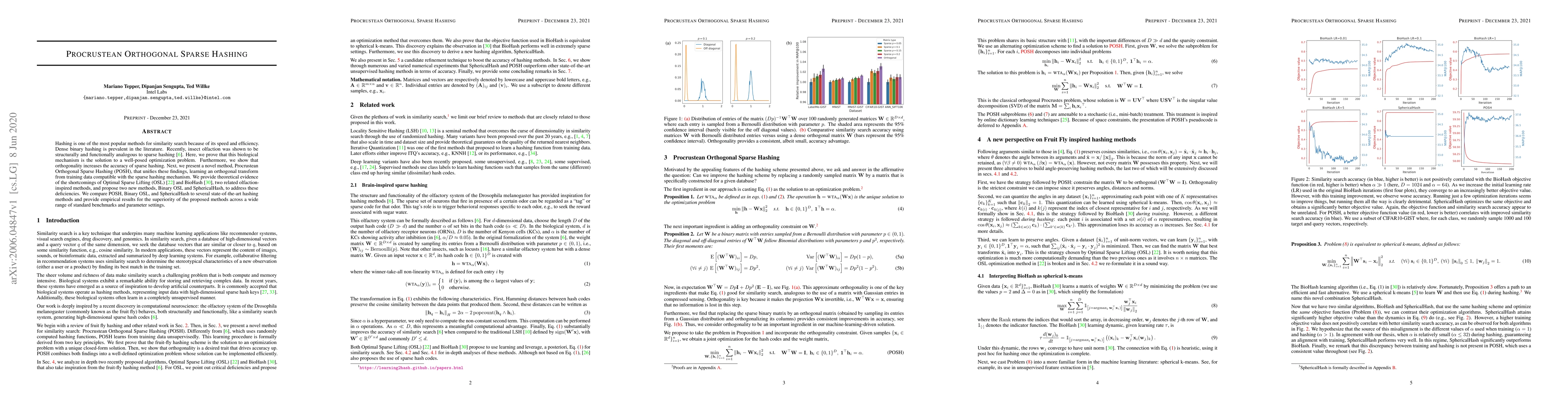 Hashing is one of the most popular methods for similarity search because of its speed and efficiency. Dense binary hashing is prevalent in the literature. Recently, insect olfaction was shown to be structurally and functionally analogous to sparse hashing [6]. Here, we prove that this biological mechanism is the solution to a well-posed optimization problem. Furthermore, we show that orthogonality increases the accuracy of sparse hashing. Next, we present a novel method, Procrustean Orthogonal Sparse Hashing (POSH), that unifies these findings, learning an orthogonal transform from training data compatible with the sparse hashing mechanism. We provide theoretical evidence of the shortcomings of Optimal Sparse Lifting (OSL) [22] and BioHash [30], two related olfaction-inspired methods, and propose two new methods, Binary OSL and SphericalHash, to address these deficiencies. We compare POSH, Binary OSL, and SphericalHash to several state-of-the-art hashing methods and provide empirical results for the superiority of the proposed methods across a wide range of standard benchmarks and parameter settings.