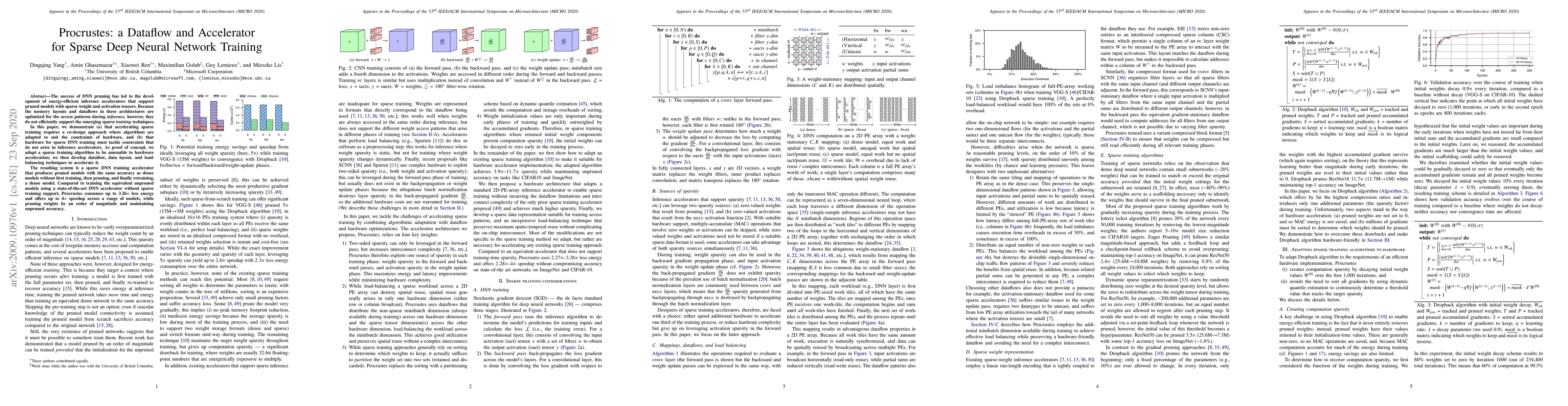 This paper introduces Procrustes, a specialized dataflow and accelerator for training sparse deep neural networks (DNNs), demonstrating that hardware must be co-designed with algorithms to efficiently support sparse training. Procrustes achieves up to 3.26× less energy consumption and 4× speedup compared to traditional DNN accelerators, while maintaining accuracy and pruning weights by an order of magnitude.