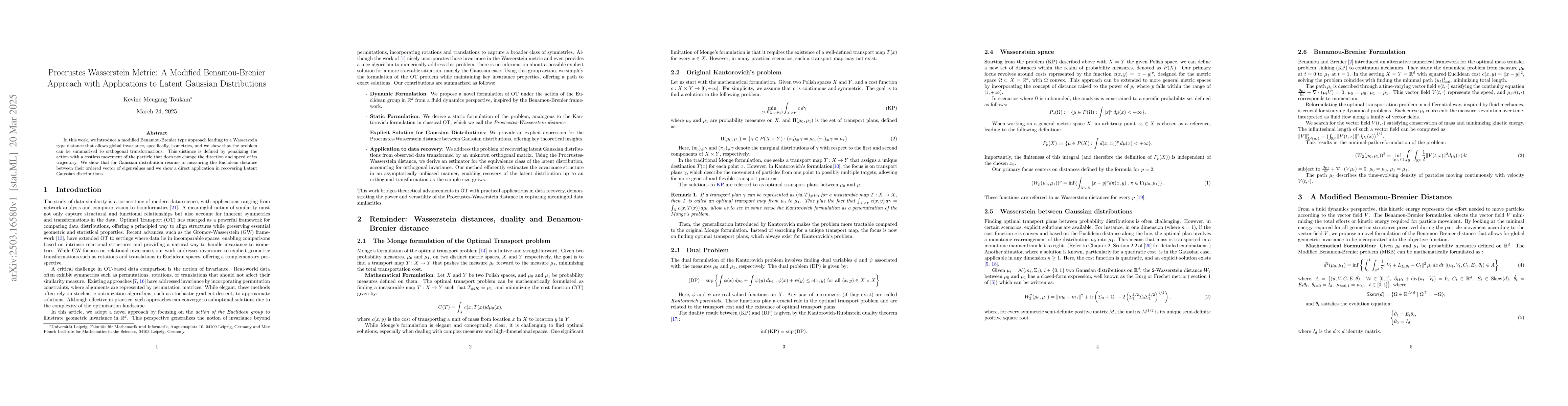 Summary: This paper proposes a modified Benamou-Brenier approach to define a Procrustes Wasserstein metric, which maintains global invariance through isometries and simplifies to orthogonal transformations. This metric measures the Euclidean distance between ordered eigenvalues of Gaussian distributions and has applications in recovering Latent Gaussian distributions.