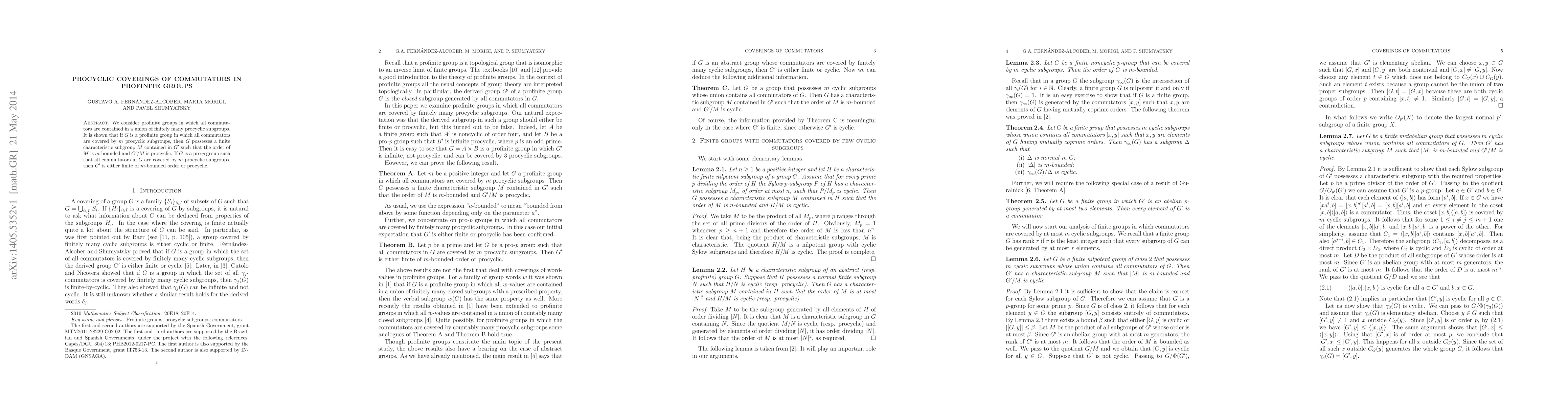 This paper investigates profinite groups where all commutators lie within a union of finitely many procyclic subgroups, proving that such groups have a finite characteristic subgroup with an m-bounded order, making the quotient by this subgroup procyclic. For pro-p groups, it concludes that the commutator subgroup is either finite and m-bounded or procyclic.