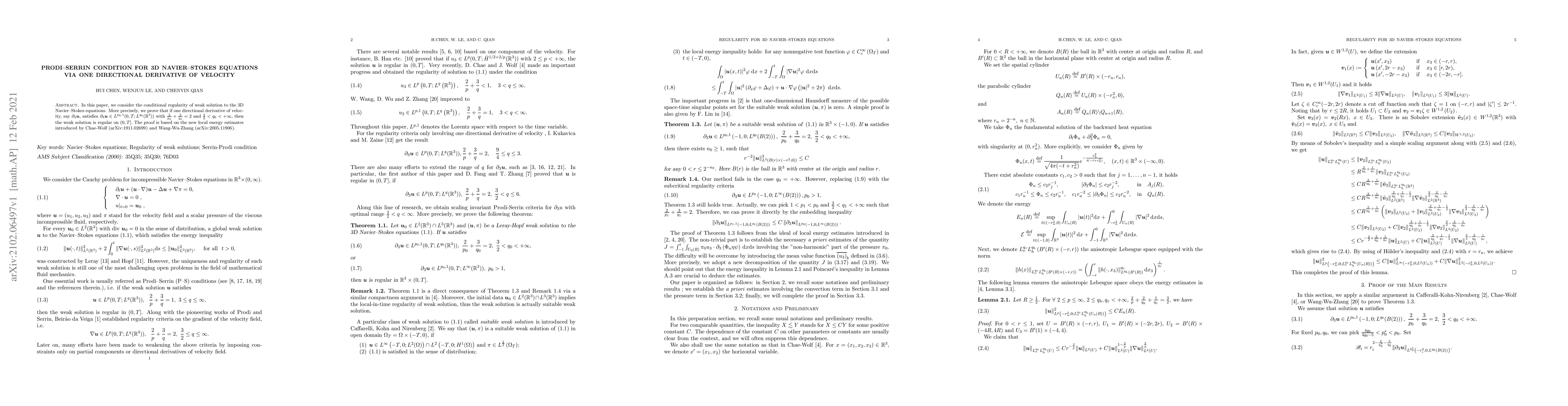 This paper proves the conditional regularity of weak solutions to the 3D Navier-Stokes equations when a specific directional derivative of velocity satisfies certain $L^{p_0,1}$ conditions. The proof leverages new local energy estimates introduced by Chae-Wolf and Wang-Wu-Zhang.