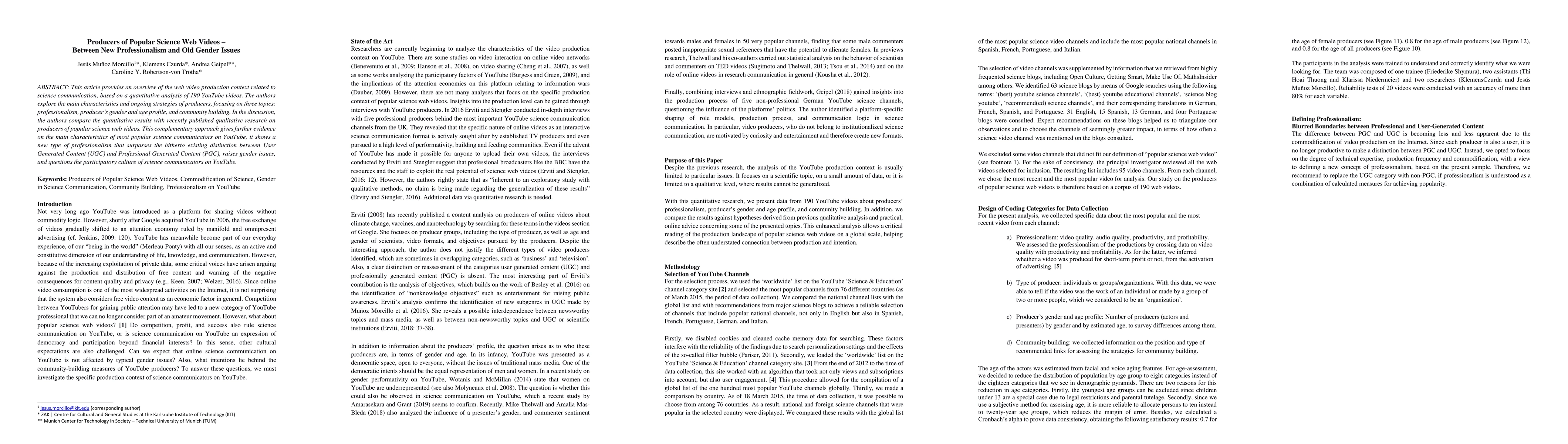 This article provides an overview of the web video production context related to science communication, based on a quantitative analysis of 190 YouTube videos. The authors explore the main characteristics and ongoing strategies of producers, focusing on three topics: professionalism, producer's gender and age profile, and community building. In the discussion, the authors compare the quantitative results with recently published qualitative research on producers of popular science web videos. This complementary approach gives further evidence on the main characteristics of most popular science communicators on YouTube, it shows a new type of professionalism that surpasses the hitherto existing distinction between User Generated Content (UGC) and Professional Generated Content (PGC), raises gender issues, and questions the participatory culture of science communicators on YouTube.
