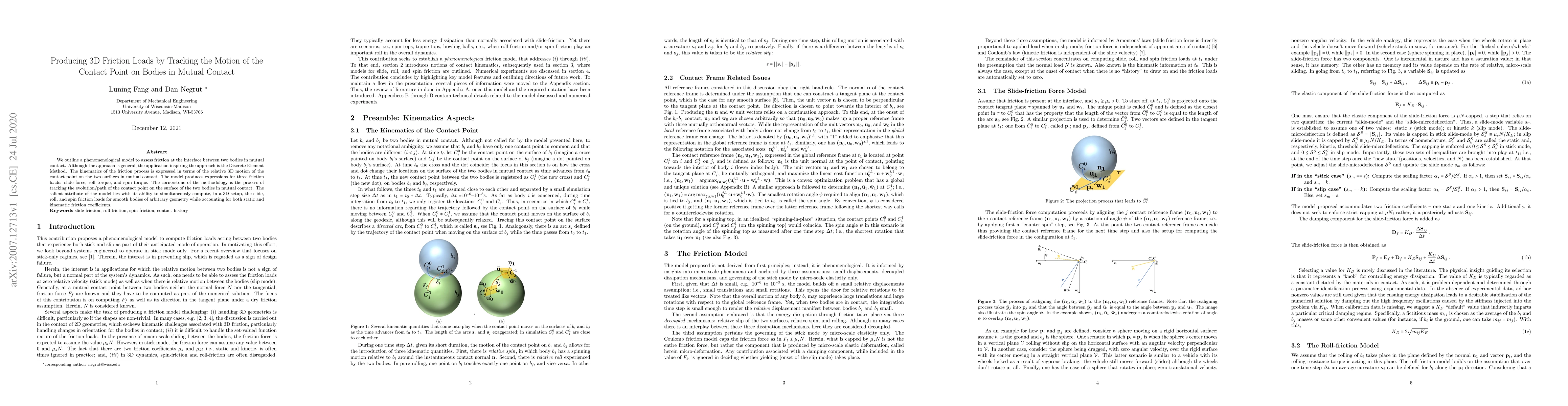 This paper presents a phenomenological model to evaluate friction at the interface between two contacting bodies, focusing on the 3D motion of the contact point. It tracks the contact point's path to compute slide force, roll torque, and spin torque, applicable to bodies of arbitrary geometry.