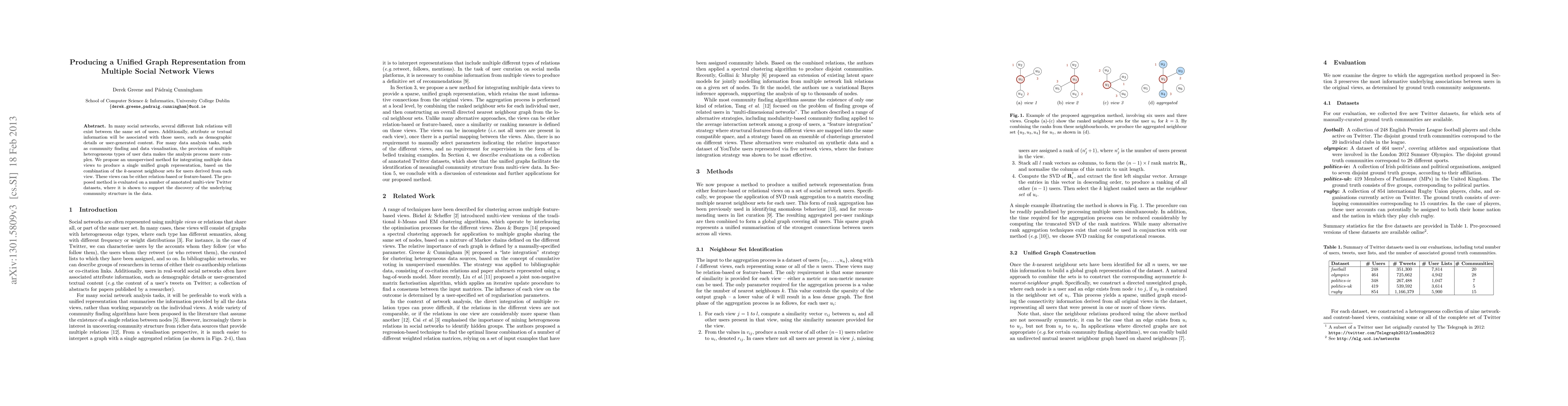 In many social networks, several different link relations will exist between the same set of users. Additionally, attribute or textual information will be associated with those users, such as demographic details or user-generated content. For many data analysis tasks, such as community finding and data visualisation, the provision of multiple heterogeneous types of user data makes the analysis process more complex. We propose an unsupervised method for integrating multiple data views to produce a single unified graph representation, based on the combination of the k-nearest neighbour sets for users derived from each view. These views can be either relation-based or feature-based. The proposed method is evaluated on a number of annotated multi-view Twitter datasets, where it is shown to support the discovery of the underlying community structure in the data.