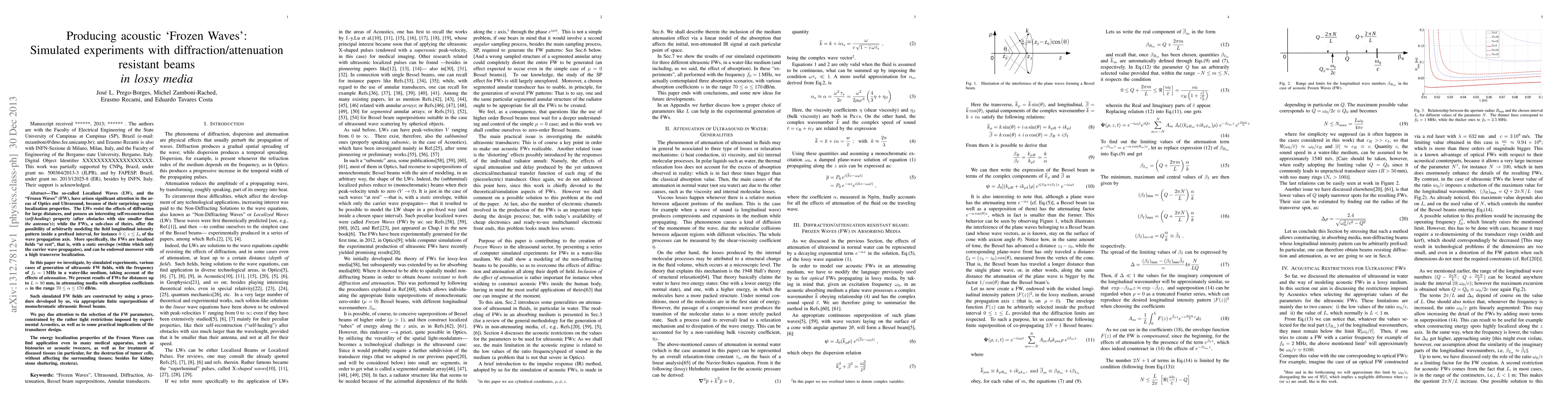 The so-called Localized Waves (LW), and the "Frozen Waves" (FW), have arisen significant attention in the areas of Optics and Ultrasound, because of their surprising energy localization properties. The LWs resist the effects of diffraction for large distances, and possess an interesting self-reconstruction (self-healing) property, after obstacles with size smaller than the antenna's; while the FWs, a sub-class of theirs, offer the possibility of arbitrarily modeling the field longitudinal intensity pattern inside a prefixed interval, for instance 0 < z < L, of the wave propagation axis. More specifically, the FWs are localized fields "at rest", that is, with a static envelope (within which only the carrier wave propagates), and can be endowed moreover with a high transverse localization. In this paper we investigate by simulated experiments, various cases of generation of ultrasonic FW fields, with frequency f_o = 1 MHz in a water-like medium, taking account of the effects of attenuation. We present results of FWs for distances up to L=80 mm, in attenuating media with absorption coefficients alpha in the range 70 < alpha < 170 dB/m. Such simulated FW fields are constructed by using a procedure developed by us, via appropriate finite superpositions of monochromatic ultrasonic Bessel beams. We pay due attention to the selection of the FW parameters, constrained by the tight restrictions imposed by experimental Acoustics, and to some practical implications of the transducer design. The energy localization properties of the Frozen Waves can find application even in many medical apparatus, such as bistouries or acoustic tweezers, and for treatment of diseased tissues (in particular, for the destruction of tumor cells, without affecting the surrounding tissues; besides for a safe kidney stone shuttering, etcetera).