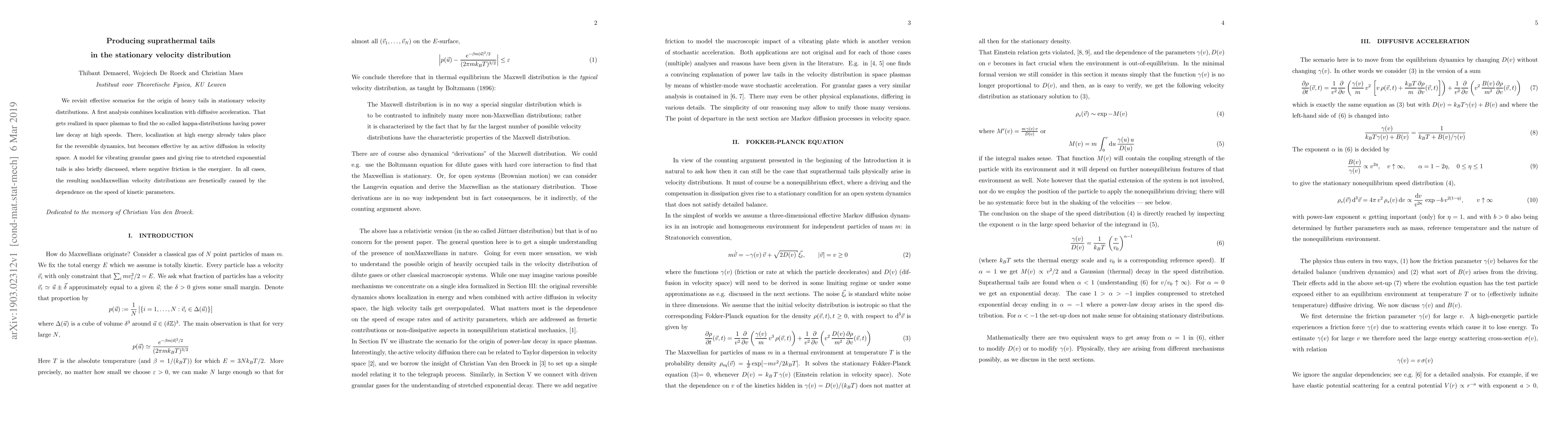 We revisit effective scenarios for the origin of heavy tails in stationary velocity distributions. A first analysis combines localization with diffusive acceleration. That gets realized in space plasmas to find the so-called kappa-distributions having power-law decay at high speeds. There, localization at high energy already takes place for the reversible dynamics but becomes effective by an active diffusion in velocity space. A model for vibrating granular gases and giving rise to stretched exponential tails is also briefly discussed, where negative friction is the energizer. In all cases, the resulting nonMaxwellian velocity distributions are frenetically caused by the dependence on the speed of kinetic parameters.