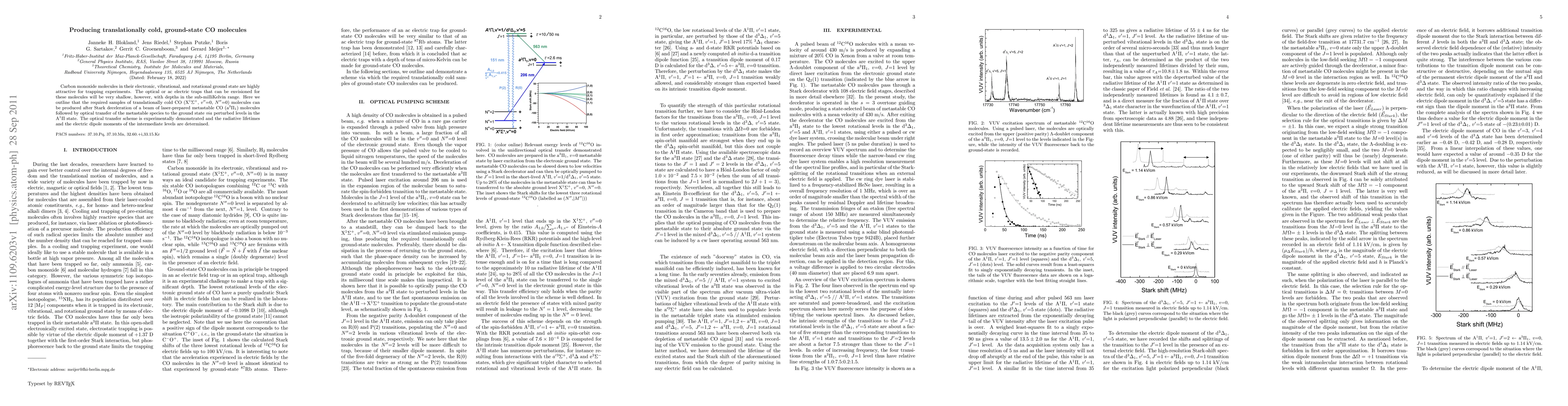 This paper describes a method to produce translationally cold, ground-state CO molecules through Stark deceleration and optical transfer from metastable states, enabling shallow optical trapping at sub-milliKelvin depths. Experimental demonstration includes determination of radiative lifetimes and electric dipole moments for the intermediate states.