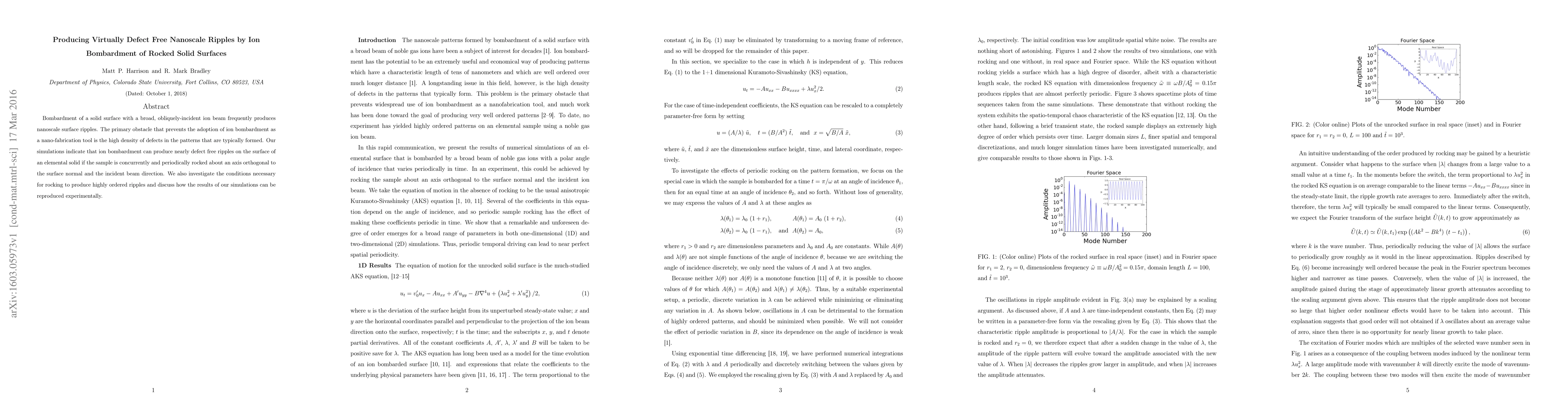 This paper explores how ion bombardment can create nearly defect-free nanoscale ripples on solid surfaces by rocking the sample during the process. Simulations reveal that rocking the surface orthogonally to the ion beam direction can produce highly ordered patterns, and the study discusses experimental conditions to achieve these results.