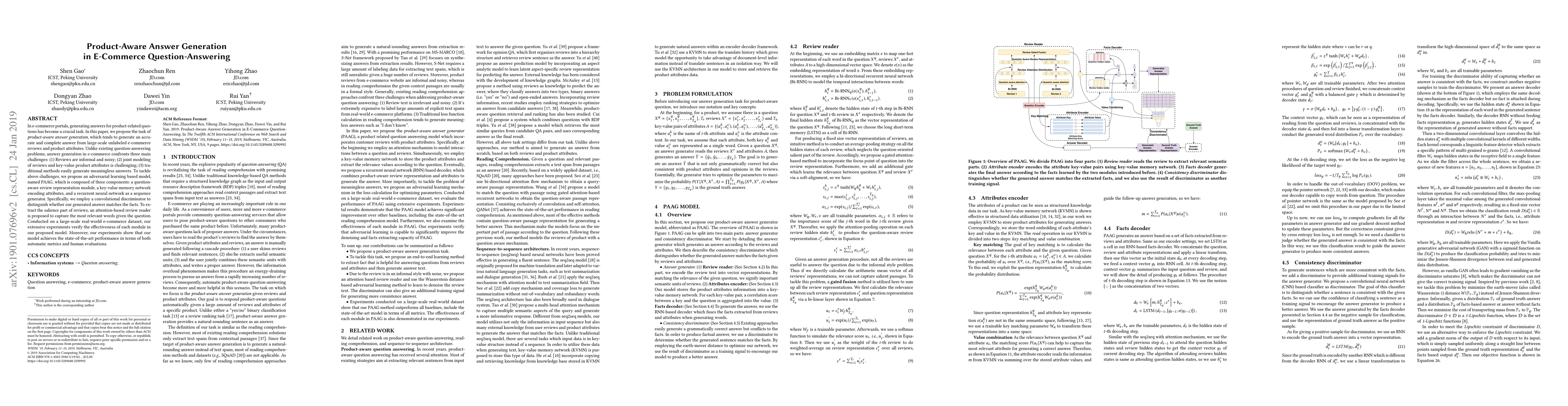 This paper proposes a product-aware answer generation model, PAAG, to generate accurate and complete answers from e-commerce reviews and product attributes, addressing challenges like informal review text and joint modeling complexities. The model uses adversarial learning, a question-aware review representation, and an attention-based review reader to achieve state-of-the-art performance.