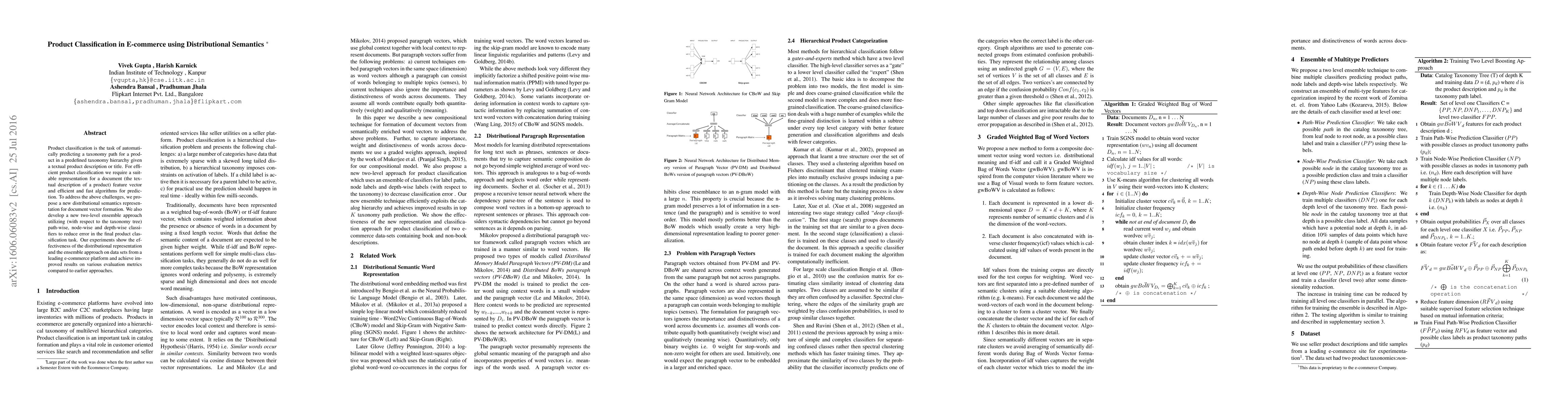 A new distributional semantics representation and a two-level ensemble approach improve product classification accuracy in e-commerce, outperforming earlier methods on various evaluation metrics.