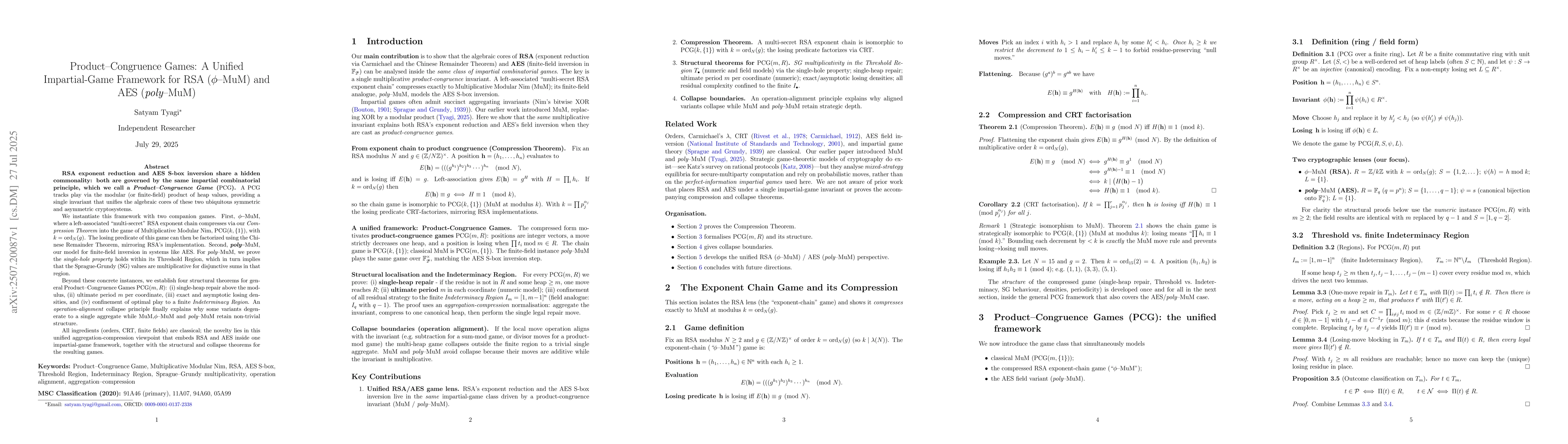 RSA exponent reduction and AES S-box inversion share a hidden commonality: both are governed by the same impartial combinatorial principle, which we call a Product-Congruence Game (PCG). A Product-Congruence Game tracks play via the modular or finite-field product of heap values, providing a single invariant that unifies the algebraic cores of these two ubiquitous symmetric and asymmetric cryptosystems. We instantiate this framework with two companion games. First, $\phi$-MuM, in which a left-associated "multi-secret" RSA exponent chain compresses into the game of Multiplicative Modular Nim, PCG($k,\{1\}$), where $k = ord_N(g)$. The losing predicate then factorizes via the Chinese remainder theorem, mirroring RSA's structure. Second, poly-MuM, our model for finite-field inversion such as the AES S-box. For poly-MuM we prove the single-hole property inside its threshold region, implying that the Sprague-Grundy values are multiplicative under disjunctive sums in that region. Beyond these instances, we establish four structural theorems for a general Product-Congruence Game PCG($m,R$): (i) single-heap repair above the modulus, (ii) ultimate period $m$ per coordinate, (iii) exact and asymptotic losing densities, and (iv) confinement of optimal play to a finite indeterminacy region. An operation-alignment collapse principle explains why some variants degenerate to a single aggregate while MuM, $\phi$-MuM and poly-MuM retain rich local structure. All ingredients (multiplicative orders, the Chinese remainder theorem, finite fields) are classical; the contribution is the unified aggregation-compression viewpoint that embeds both RSA and AES inside one impartial-game framework, together with the structural and collapse theorems.