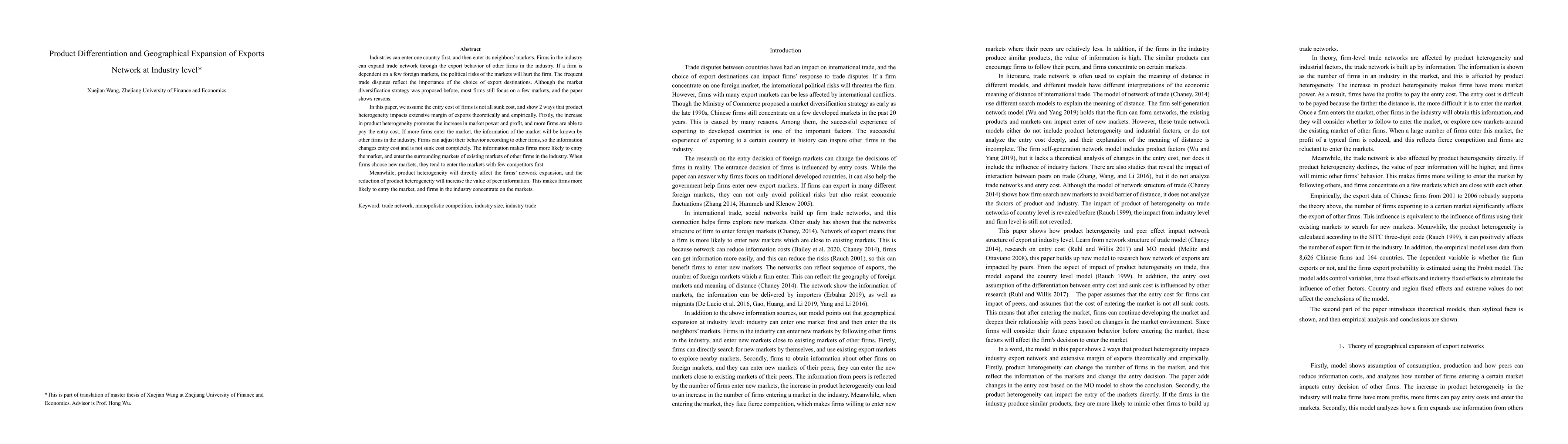 Industries can enter one country first, and then enter its neighbors' markets. Firms in the industry can expand trade network through the export behavior of other firms in the industry. If a firm is dependent on a few foreign markets, the political risks of the markets will hurt the firm. The frequent trade disputes reflect the importance of the choice of export destinations. Although the market diversification strategy was proposed before, most firms still focus on a few markets, and the paper shows reasons.In this paper, we assume the entry cost of firms is not all sunk cost, and show 2 ways that product heterogeneity impacts extensive margin of exports theoretically and empirically. Firstly, the increase in product heterogeneity promotes the increase in market power and profit, and more firms are able to pay the entry cost. If more firms enter the market, the information of the market will be known by other firms in the industry. Firms can adjust their behavior according to other firms, so the information changes entry cost and is not sunk cost completely. The information makes firms more likely to entry the market, and enter the surrounding markets of existing markets of other firms in the industry. When firms choose new markets, they tend to enter the markets with few competitors first.Meanwhile, product heterogeneity will directly affect the firms' network expansion, and the reduction of product heterogeneity will increase the value of peer information. This makes firms more likely to entry the market, and firms in the industry concentrate on the markets.