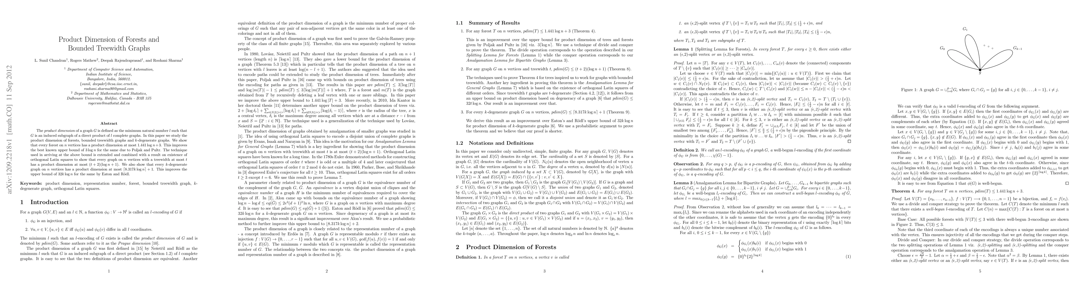 This paper studies the product dimension of various graph classes, showing that forests have a product dimension of at most 1.441logn+3, improving previous bounds. It also establishes product dimension bounds for graphs with bounded treewidth and k-degenerate graphs, using advanced combinatorial techniques.