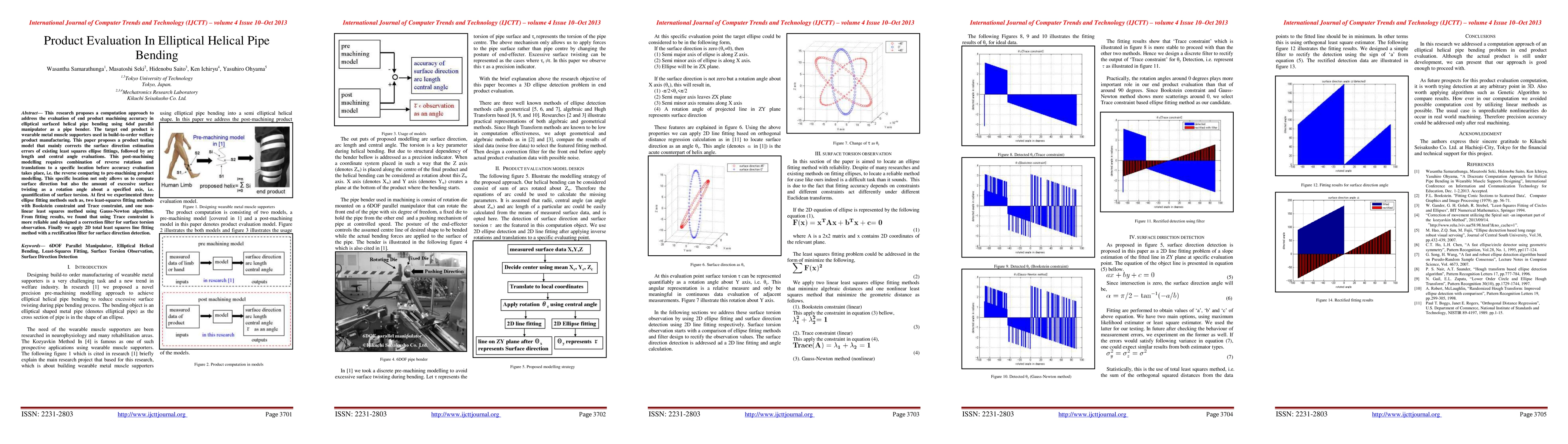 This research proposes a computation approach to address the evaluation of end product machining accuracy in elliptical surfaced helical pipe bending using 6dof parallel manipulator as a pipe bender. The target end product is wearable metal muscle supporters used in build-to-order welfare product manufacturing. This paper proposes a product testing model that mainly corrects the surface direction estimation errors of existing least squares ellipse fittings, followed by arc length and central angle evaluations. This post-machining modelling requires combination of reverse rotations and translations to a specific location before accuracy evaluation takes place, i.e. the reverse comparing to pre-machining product modelling. This specific location not only allows us to compute surface direction but also the amount of excessive surface twisting as a rotation angle about a specified axis, i.e. quantification of surface torsion. At first we experimented three ellipse fitting methods such as, two least-squares fitting methods with Bookstein constraint and Trace constraint, and one non- linear least squares method using Gauss-Newton algorithm. From fitting results, we found that using Trace constraint is more reliable and designed a correction filter for surface torsion observation. Finally we apply 2D total least squares line fitting method with a rectification filter for surface direction detection.