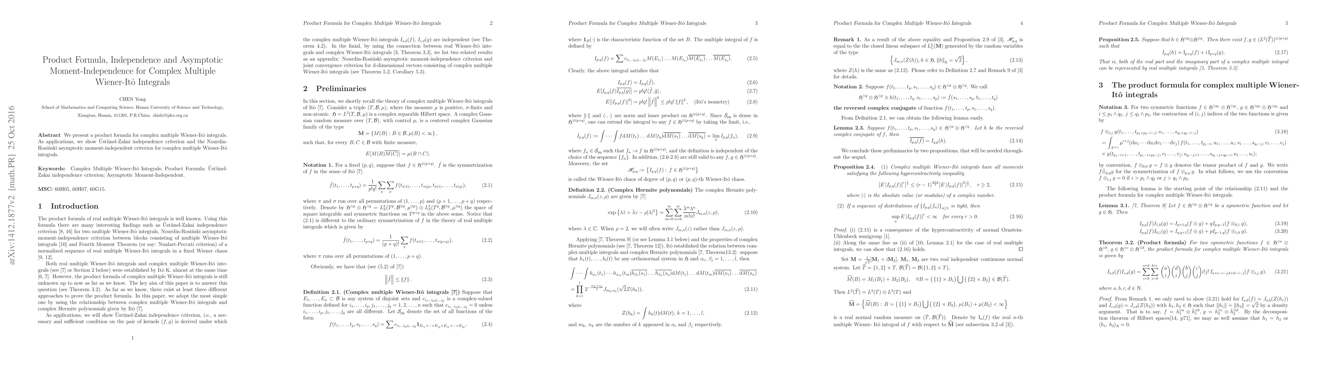 This paper introduces a product formula for complex multiple Wiener-Ito integrals and applies it to demonstrate the Ustunel-Zakai independence criterion, the Nourdin-Rosinski asymptotic moment-independence criterion, and a joint convergence criterion for these integrals.