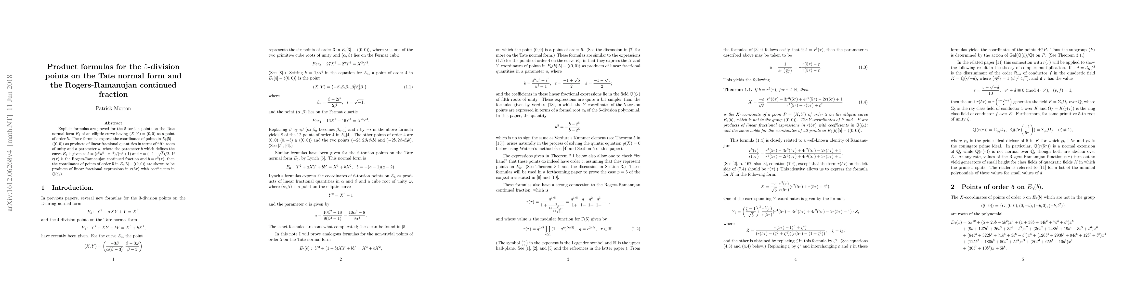 Explicit formulas are proved for the $5$-torsion points on the Tate normal form $E_5$ of an elliptic curve having $(X,Y)=(0,0)$ as a point of order $5$. These formulas express the coordinates of points in $E_5[5] - \langle(0,0)\rangle$ as products of linear fractional quantities in terms of $5$-th roots of unity and a parameter $u$, where the parameter $b$ which defines the curve $E_5$ is given as $b=(\varepsilon^5 u^5- \varepsilon^{-5})/(u^5+1)$ and $\varepsilon = (-1+\sqrt{5})/2$. If $r(\tau)$ is the Rogers-Ramanujan continued fraction and $b=r^5(\tau)$, then the coordinates of points of order $5$ in $E_5[5] - \langle(0,0)\rangle$ are shown to be products of linear fractional expressions in $r(5\tau)$ with coefficients in $\mathbb{Q}(\zeta_5)$.
