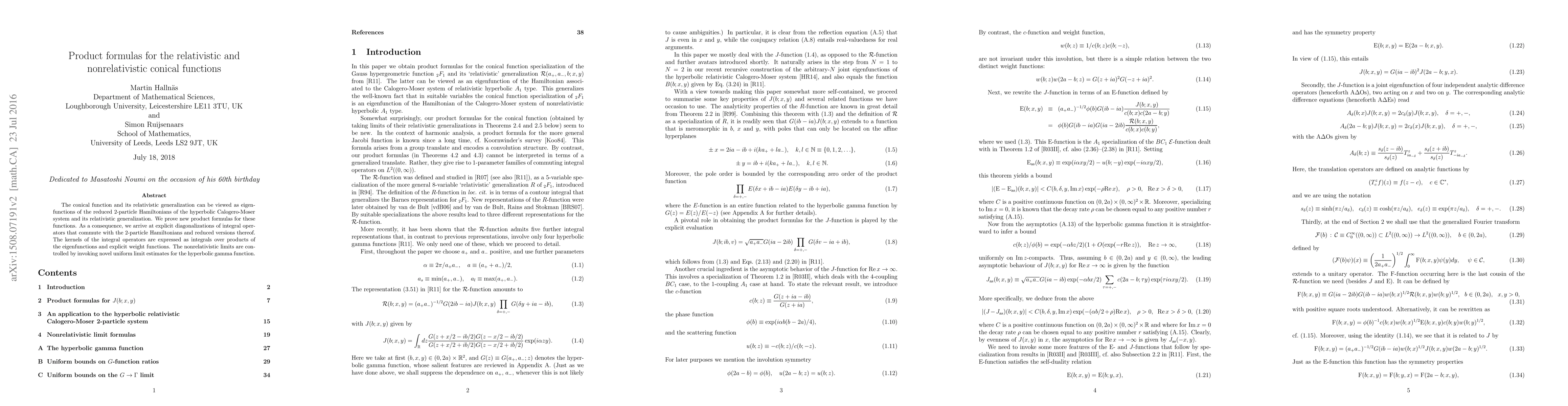 The conical function and its relativistic generalization can be viewed as eigenfunctions of the reduced 2-particle Hamiltonians of the hyperbolic Calogero-Moser system and its relativistic generalization. We prove new product formulas for these functions. As a consequence, we arrive at explicit diagonalizations of integral operators that commute with the 2-particle Hamiltonians and reduced versions thereof. The kernels of the integral operators are expressed as integrals over products of the eigenfunctions and explicit weight functions. The nonrelativistic limits are controlled by invoking novel uniform limit estimates for the hyperbolic gamma function.