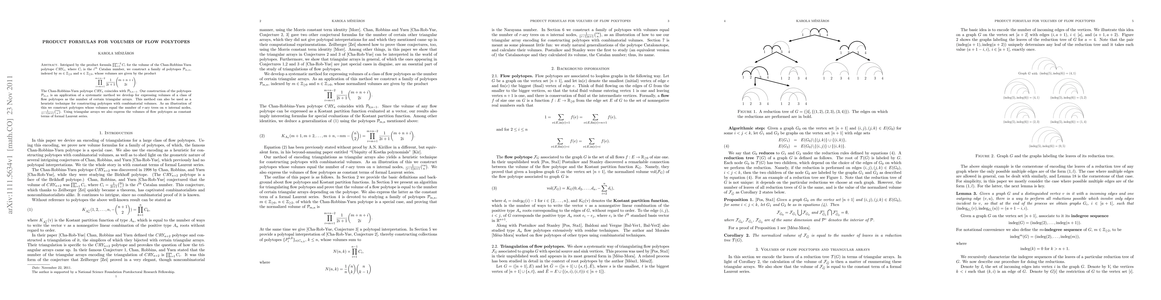 Intrigued by the product formula prod_{i=1}^{n-2} C_i for the volume of the Chan-Robbins-Yuen polytope CRY_n, where C_i is the ith Catalan number, we construct a family of polytopes P_{m,n}, whose volumes are given by the product \prod_{i=m+1}^{m+n-2}\frac{1}{2i+1}{{m+n+i} \choose {2i}}. The Chan-Robbins-Yuen polytope CRY_n coincides with P_{0,n-1}. Our construction of the polytopes P_{m,n} is an application of a systematic method we develop for expressing volumes of a class of flow polytopes as the number of certain triangular arrays. This method can also be used as a heuristic technique for constructing polytopes with combinatorial volumes. As an illustration of this we construct polytopes whose volumes equal the number of r-ary trees on n internal nodes, \frac{1}{(r-1)n+1} {{rn} \choose n}. Using triangular arrays we also express the volumes of flow polytopes as constant terms of formal Laurent series.