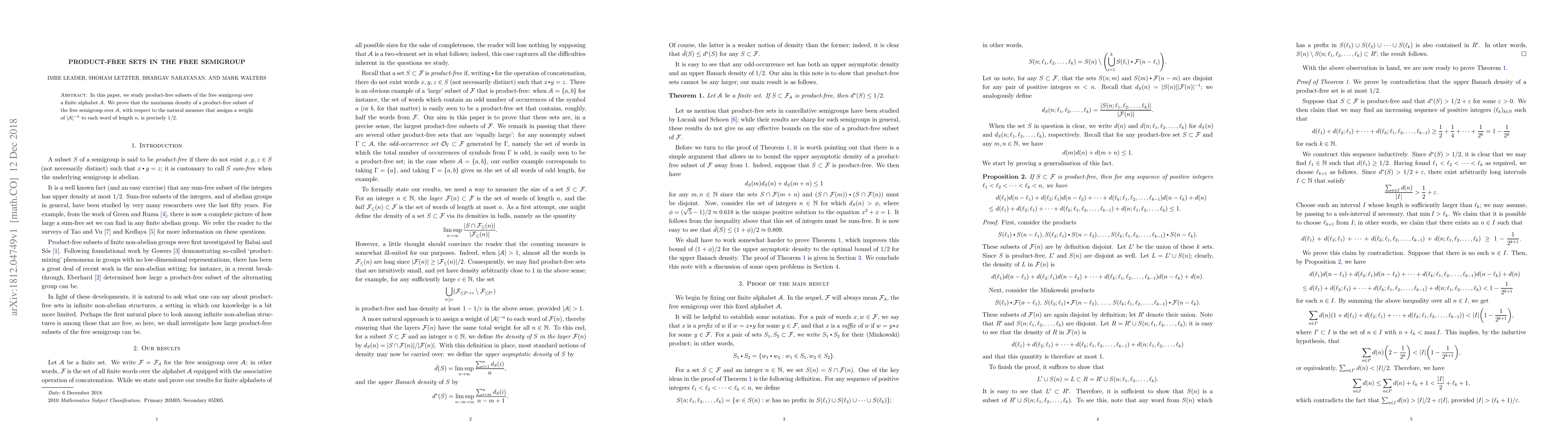 This paper investigates product-free subsets within the free semigroup generated by a finite alphabet $A$, demonstrating that the maximum density of such subsets, measured by the weight assigned to words of length $n$, is exactly $1/2$.
