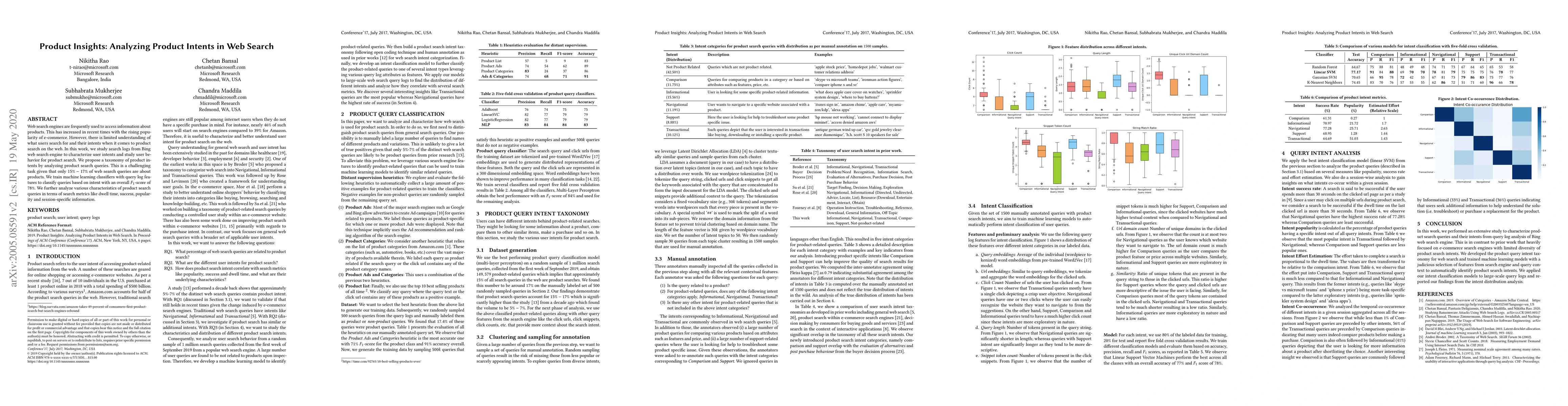 The research analyzes Bing web search engine logs to characterize user intents and behavior for product search, proposing a taxonomy of product intents through machine learning classifiers with an F1-score of 78%.