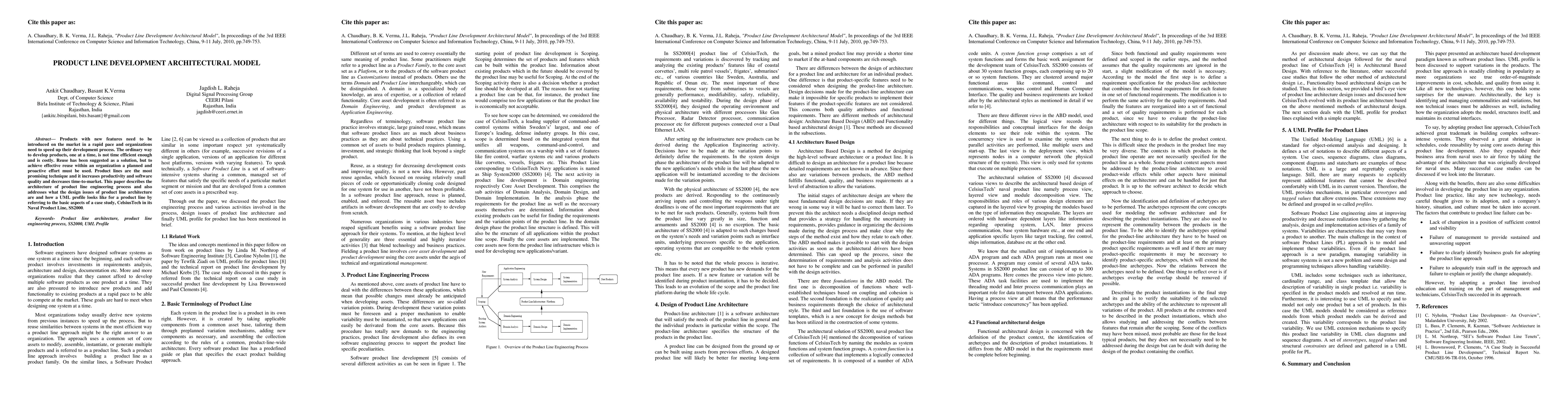 This paper outlines the architecture of product line engineering to expedite the development of new features, emphasizing the benefits of reuse to increase productivity and software quality while reducing time-to-market. It discusses design issues and presents a UML profile for a product line, illustrated through a case study of CelsiusTech's Naval Product Line, SS2000.
