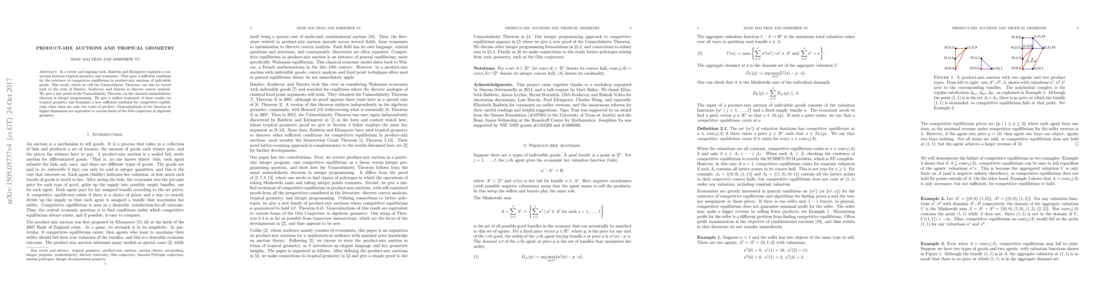 In a recent and ongoing work, Baldwin and Klemperer explored a connection between tropical geometry and economics. They gave a sufficient condition for the existence of competitive equilibrium in product-mix auctions of indivisible goods. This result, which we call the Unimodularity Theorem, can also be traced back to the work of Danilov, Koshevoy, and Murota in discrete convex analysis. We give a new proof of the Unimodularity Theorem via the classical unimodularity theorem in integer programming. We give a unified treatment of these results via tropical geometry and formulate a new sufficient condition for competitive equilibrium when there are only two types of product. Generalizations of our theorem in higher dimensions are equivalent to various forms of the Oda conjecture in algebraic geometry.
