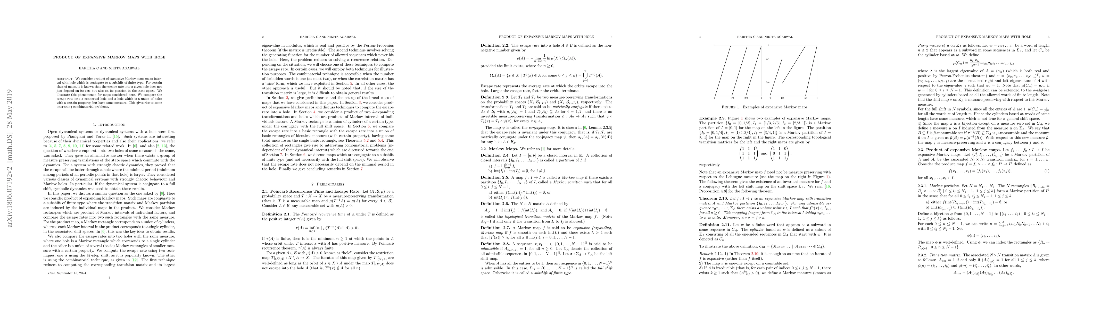 We consider product of expansive Markov maps on an interval with hole which is conjugate to a subshift of finite type. For certain class of maps, it is known that the escape rate into a given hole does not just depend on its size but also on its position in the state space. We illustrate this phenomenon for maps considered here. We compare the escape rate into a connected hole and a hole which is a union of holes with a certain property, but have same measure. This gives rise to some interesting combinatorial problems.