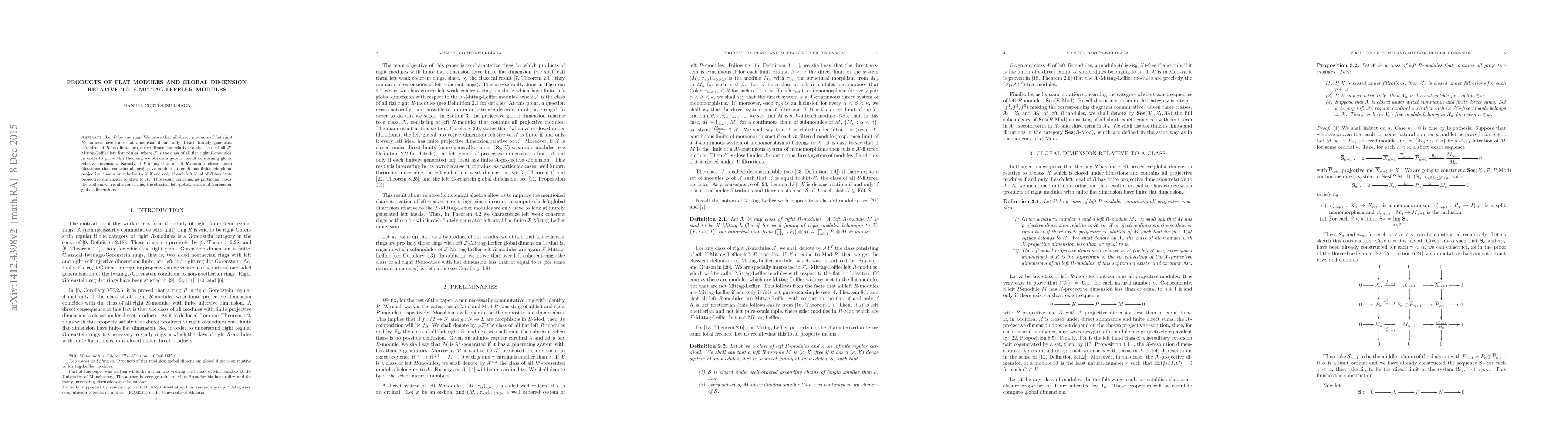 Summary: The paper establishes a connection between the flat dimensions of direct products of flat modules and the projective dimensions of finitely generated left ideals relative to $\mathcal F$-Mittag-Leffler modules. It also proves a general result on global relative dimension, linking it to the finiteness of projective dimensions of left ideals relative to a specified class of modules.