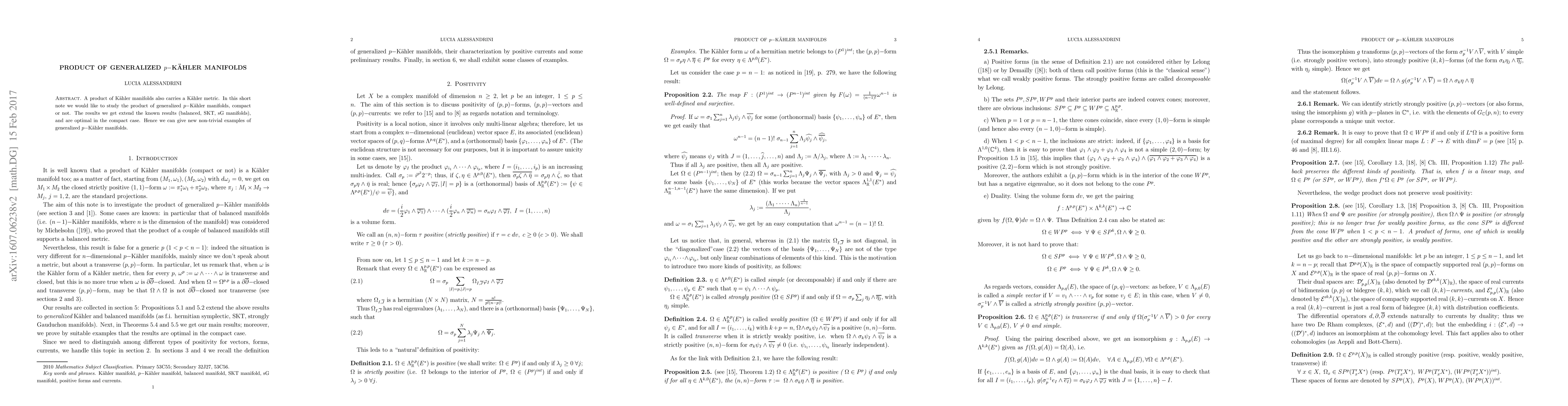 A product of K\"ahler manifolds also carries a K\"ahler metric. In this short note we would like to study the product of generalized $p-$K\"ahler manifolds, compact or not. The results we get extend the known results (balanced, SKT, sG manifolds), and are optimal in the compact case. Hence we can give new non-trivial examples of generalized $p-$K\"ahler manifolds.