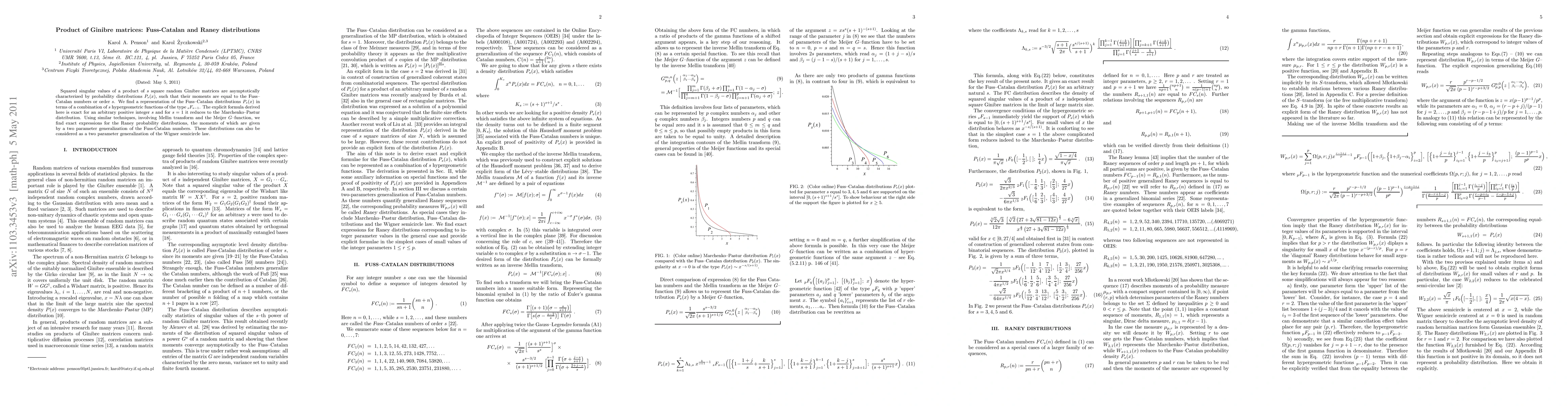 This paper investigates the probability distributions of the squared singular values of products of Ginibre matrices, revealing Fuss-Catalan and Raney distributions characterized by moments corresponding to specific number sequences. It derives exact formulas for these distributions using hypergeometric functions and the Meijer G-function.