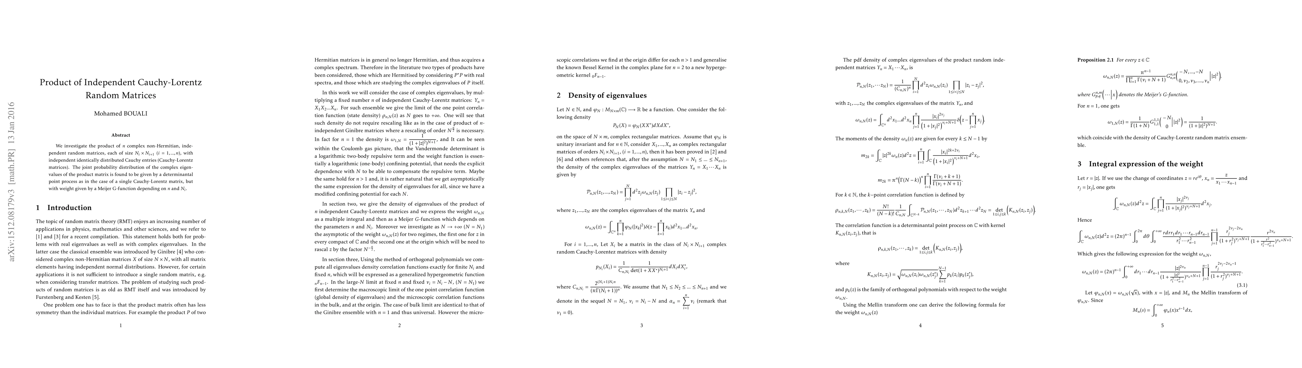 This paper studies the product of $n$ independent Cauchy-Lorentz random matrices, finding that their complex eigenvalues follow a determinantal point process with a weight function determined by a Meijer G-function, dependent on the number of matrices and their respective sizes.