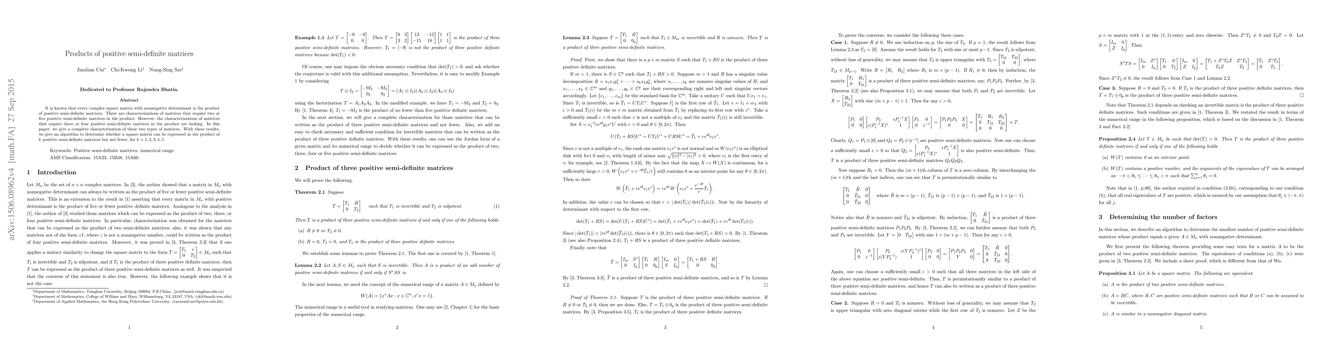 It is known that every complex square matrix with nonnegative determinant is the product of positive semi-definite matrices. There are characterizations of matrices that require two or five positive semi-definite matrices in the product. However, the characterizations of matrices that require three or four positive semi-definite matrices in the product are lacking. In this paper, we give a complete characterization of these two types of matrices. With these results, we give an algorithm to determine whether a square matrix can be expressed as the product of $k$ positive semi-definite matrices but not fewer, for $k = 1,2,3,4,5$.