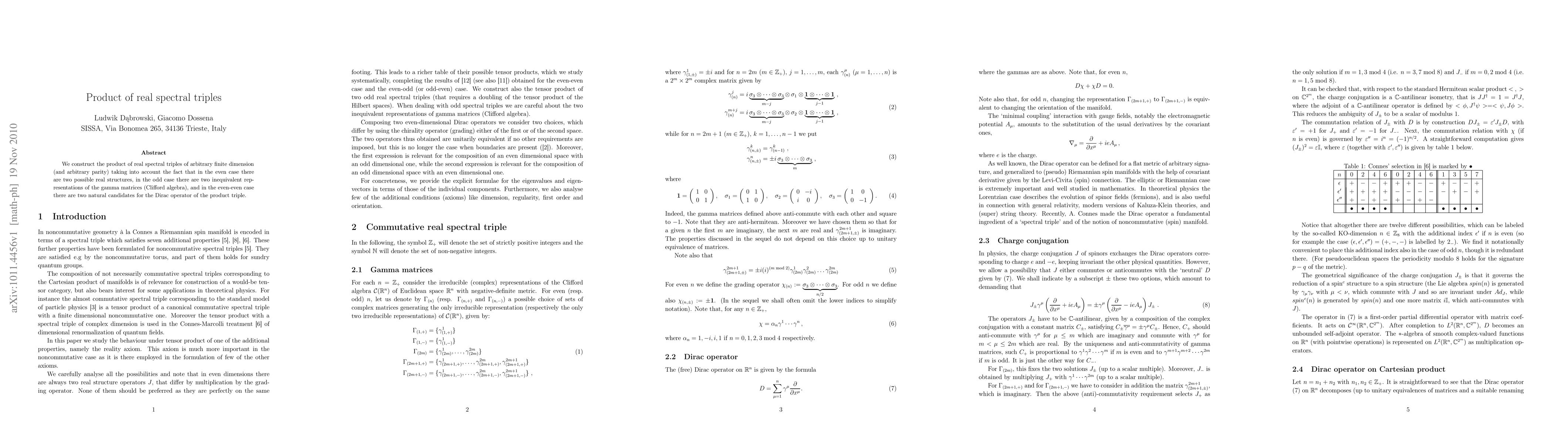 We construct the product of real spectral triples of arbitrary finite dimension (and arbitrary parity) taking into account the fact that in the even case there are two possible real structures, in the odd case there are two inequivalent representations of the gamma matrices (Clifford algebra), and in the even-even case there are two natural candidates for the Dirac operator of the product triple.