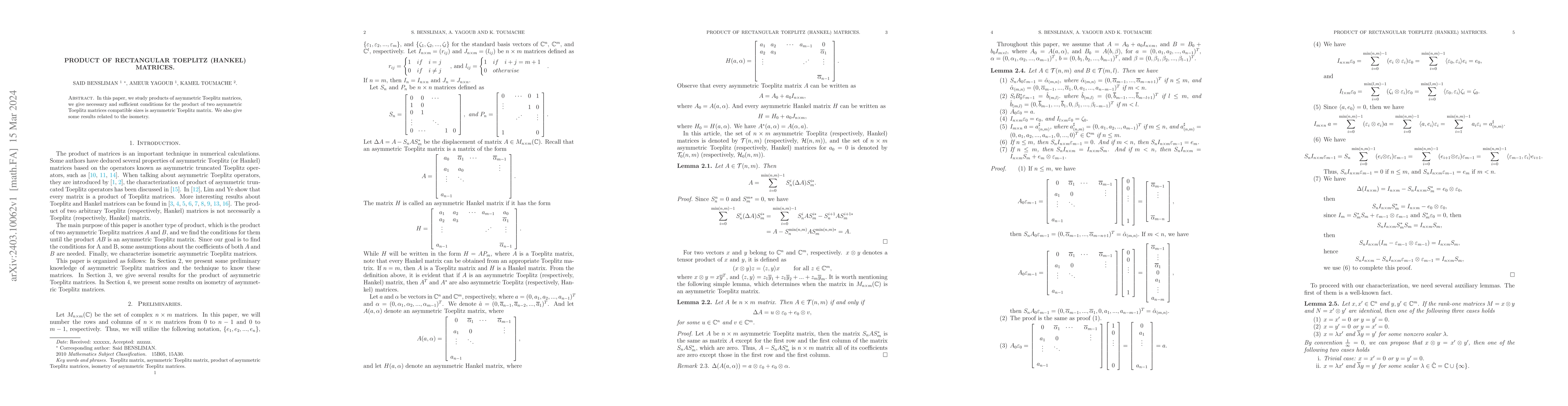 This paper investigates the product of two asymmetric Toeplitz matrices, establishing necessary and sufficient conditions for their product to also be an asymmetric Toeplitz matrix. It also explores related results concerning isometry properties.